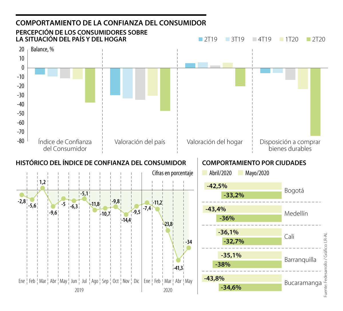 “Los resultados de la confianza del consumidor en mayo reflejan lo que habíamos anticipado hace unas semanas: que la economía probablemente tocó fondo en el mes de abril. Aunque las cifras siguen siendo muy negativas porque la economía siguió en terreno negativo, debería mejorar paulatinamente en los próximos meses.”, dijo Luis Fernando Mejía, director del centro de estudios.