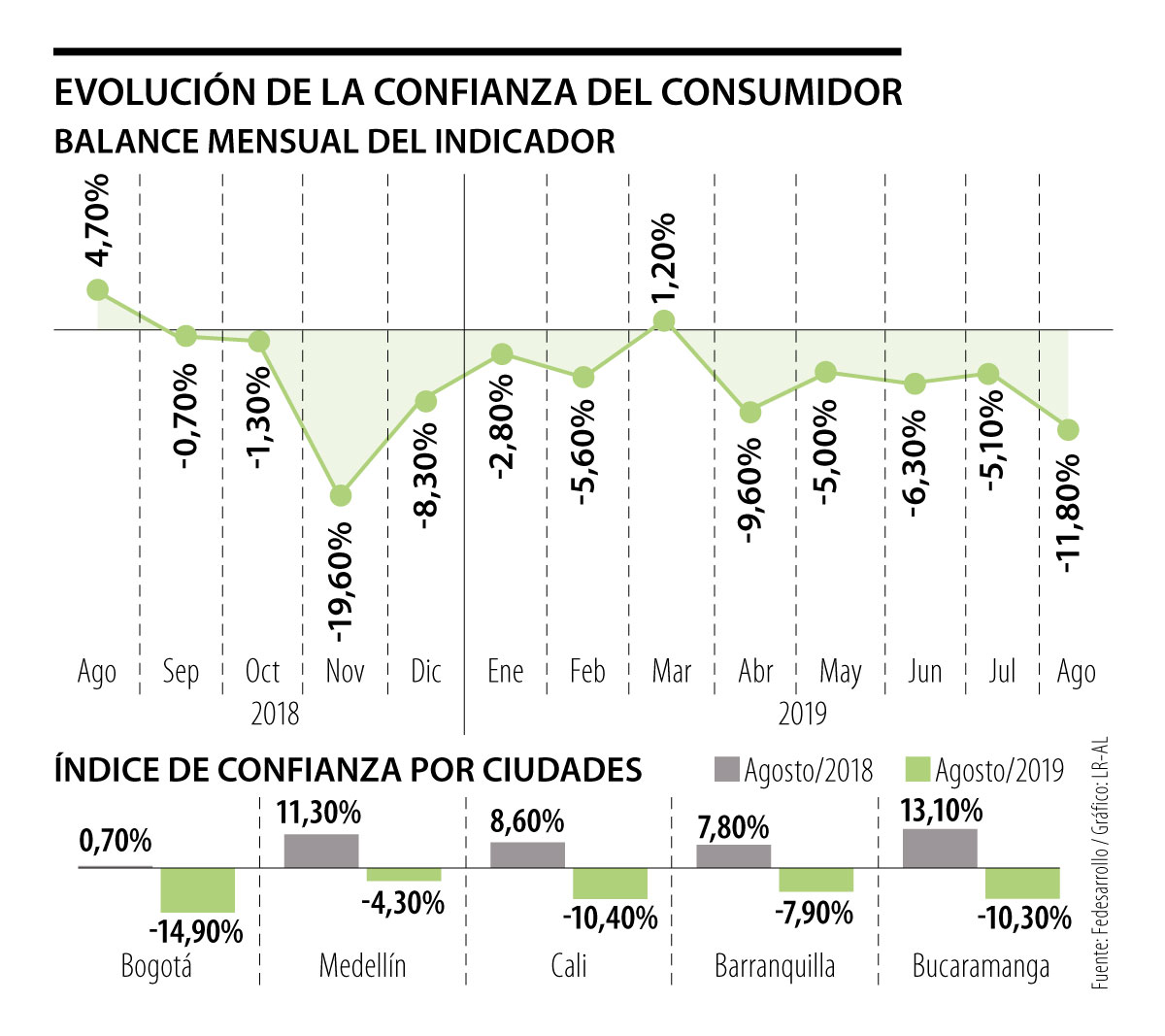 Pese al repunte en las ventas del comercio minorista de los últimos meses, el Índice de Confianza del Consumidor (ICC) registró de nuevo en agosto un retroceso al caer 11,8%, lo que representa una disminución de 6,7 puntos porcentuales frente al mes anterior (-5,9%) y una caída de 16,5 pp respecto al indicador de hace un año (4,70%). Con esto, se cumplen cinco meses consecutivos en terreno negativo.