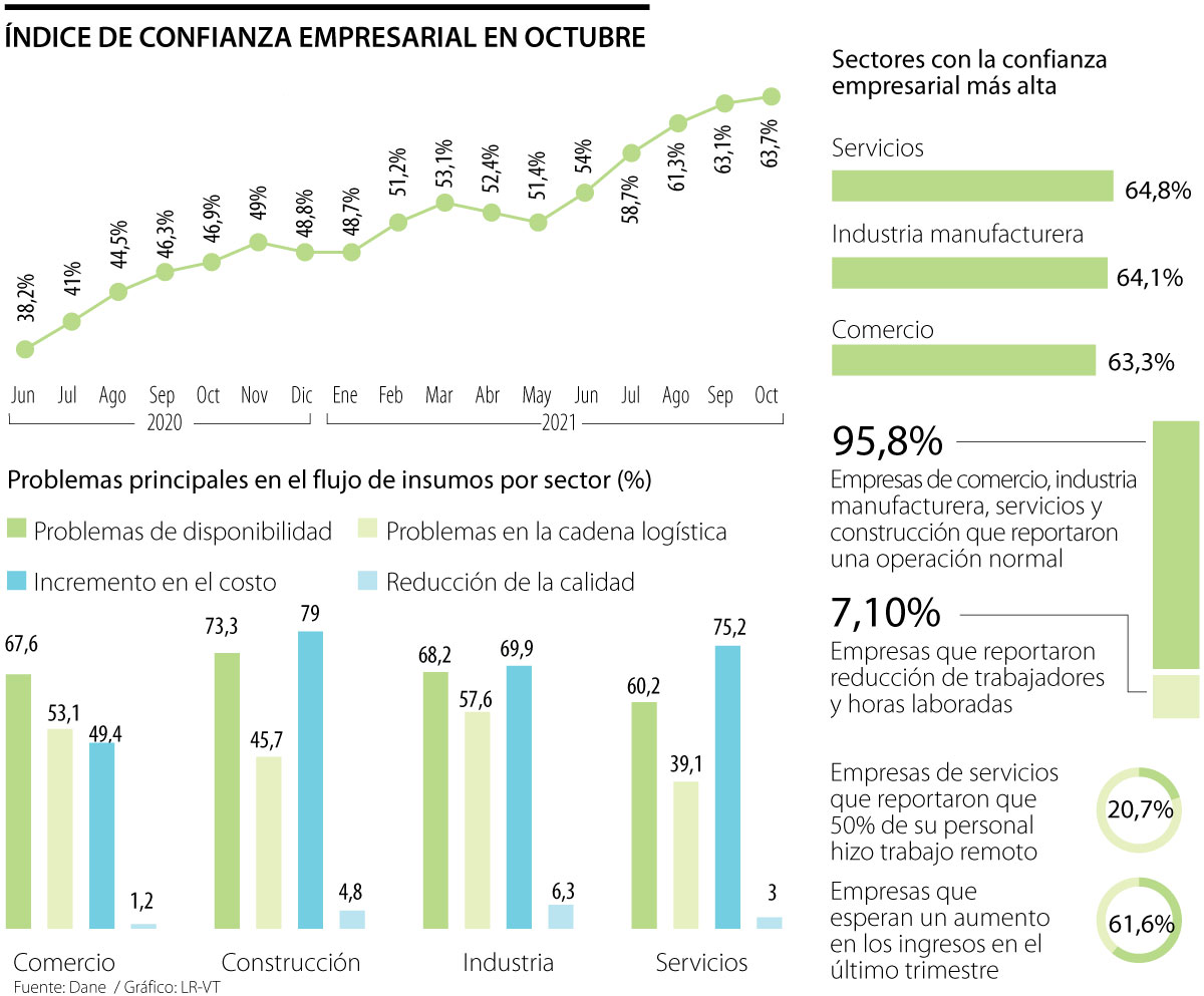 Como resultado de la reactivación económica, el Índice de Confianza Empresarial realizado por el Dane, aumentó 0,6 puntos porcentuales, llegando a 63,7% en octubre, lo que significa un máximo histórico desde la creación del indicador.