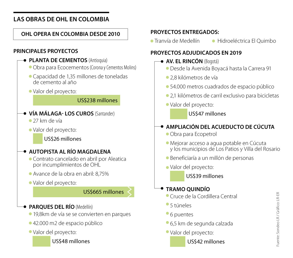Además de la adjudicación del tramo Quindío, este año OHL también se quedó con la Av. El Rincón (Bogotá), un proyecto valorado en US$47 millones, y la ampliación del acueducto de Cúcuta, una obra para Ecopetrol por US$39 millones. También ha manifestado su interés en obras como el Transmilenio por la Carrera Séptima.