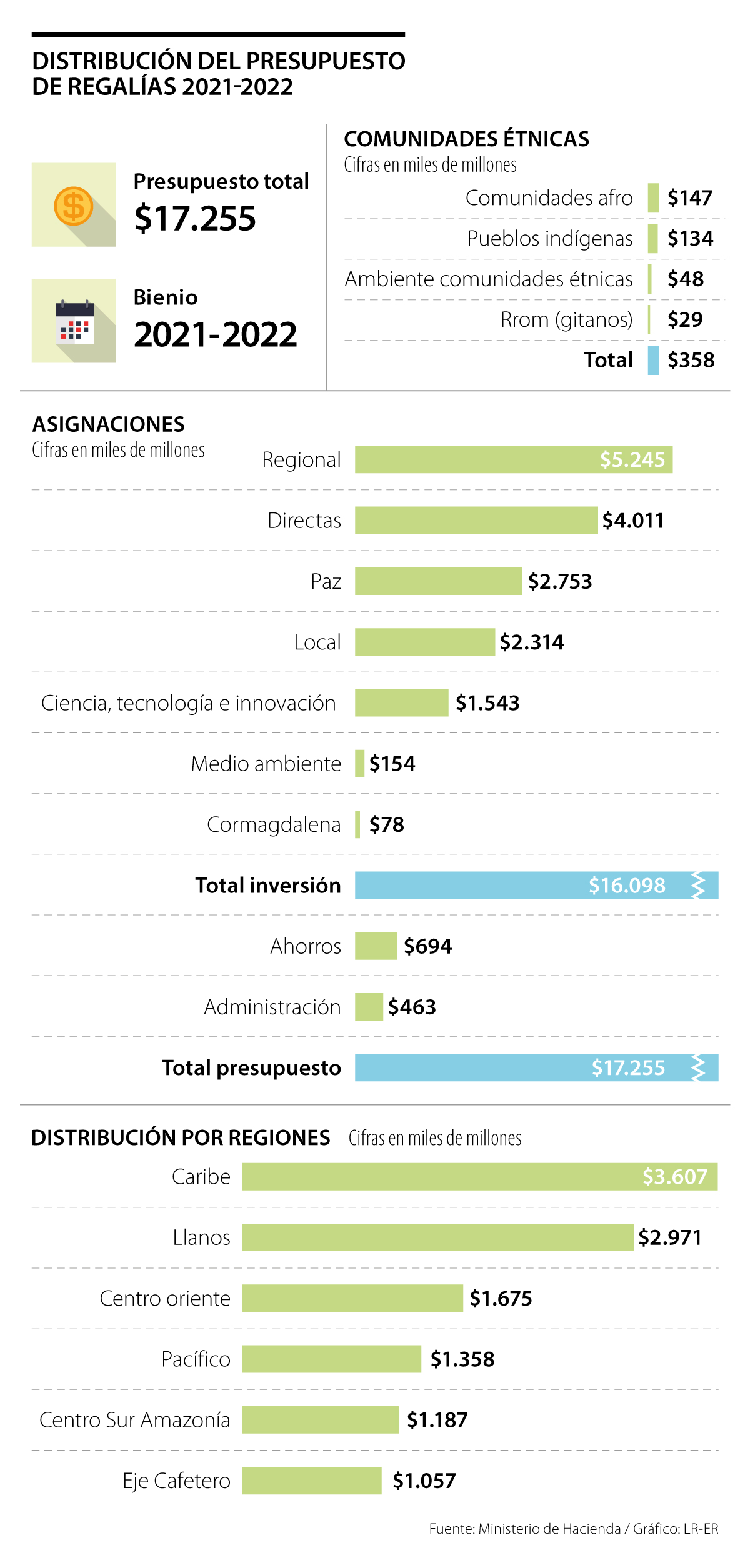 Otro de los valores agregados que, según Hacienda, tiene el proyecto de regalías, es que las comunidades étnicas tienen asignaciones por $358.000 millones, de los cuales, $147.000 millones serán destinados a las poblaciones afrocolombianas; $134.000 millones más a los pueblos indígenas; $29.000 millones a los Rrom (gitanos) y $48.000 millones son de uso exclusivo para el ambiente en estas comunidades.
