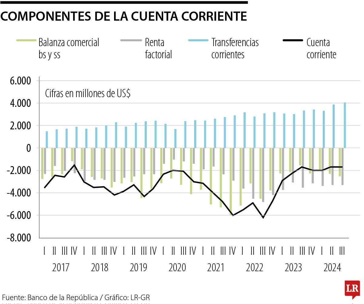 “Estos resultados fueron compensados parcialmente por los ingresos netos de transferencias corrientes de US$4.073 millones”, dice el Banco de la República.