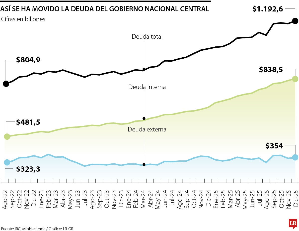 Con corte a diciembre de 2025, y según cifras del Investors Relations Colombia, IRC, del Ministerio de Hacienda y Crédito Público, la deuda bruta del Gobierno Nacional Central continúa acelerándose y alcanzó los $1.192 billones. Al revisar la evolución desde agosto de 2022, cuando asumió el presidente Gustavo Petro, el endeudamiento se ha incrementado en 48,3% frente a un nivel cercano a los $804 billones en ese momento. Es decir, un repunte de $388 billones.
