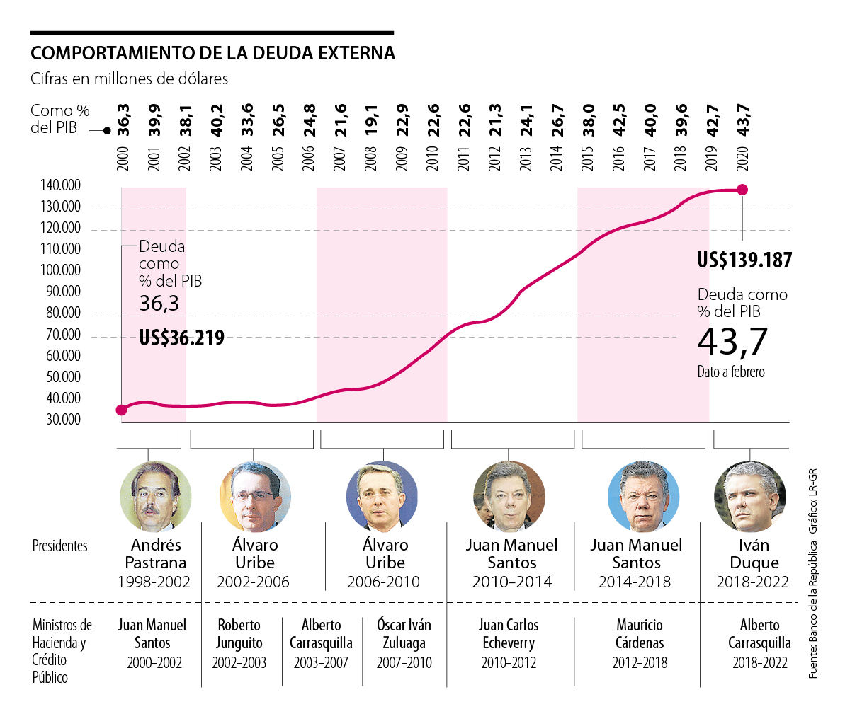 En los años que van del nuevo milenio han pasado cuatro Presidentes y seis ministros de Hacienda, y otro sinnúmero de cifras que hablan de la economía local. Sin embargo, hay una que llama la atención: 20 puntos subiría la deuda externa del país, al pasar de ser 36,3% del PIB a 56% este año .