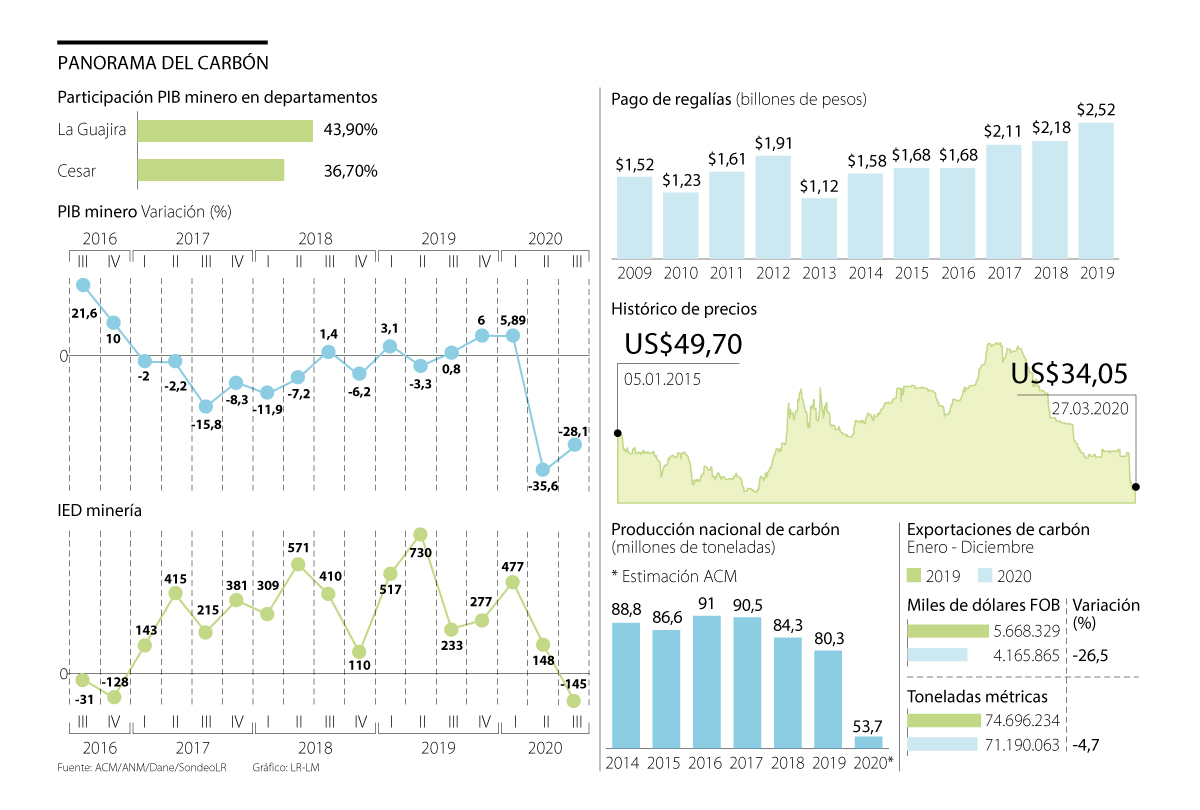 El coletazo se sentirá también en las arcas nacionales, pues el carbón representa más de 80% de las regalías del sector minero y 15% de las regalías del sector minero-energético. Además, porque cerca de 90% del carbón se exporta y, en 2020, sus ventas externas fueron de $4,16 billones, lo que supone una caída de 26,5% frente a 2019.