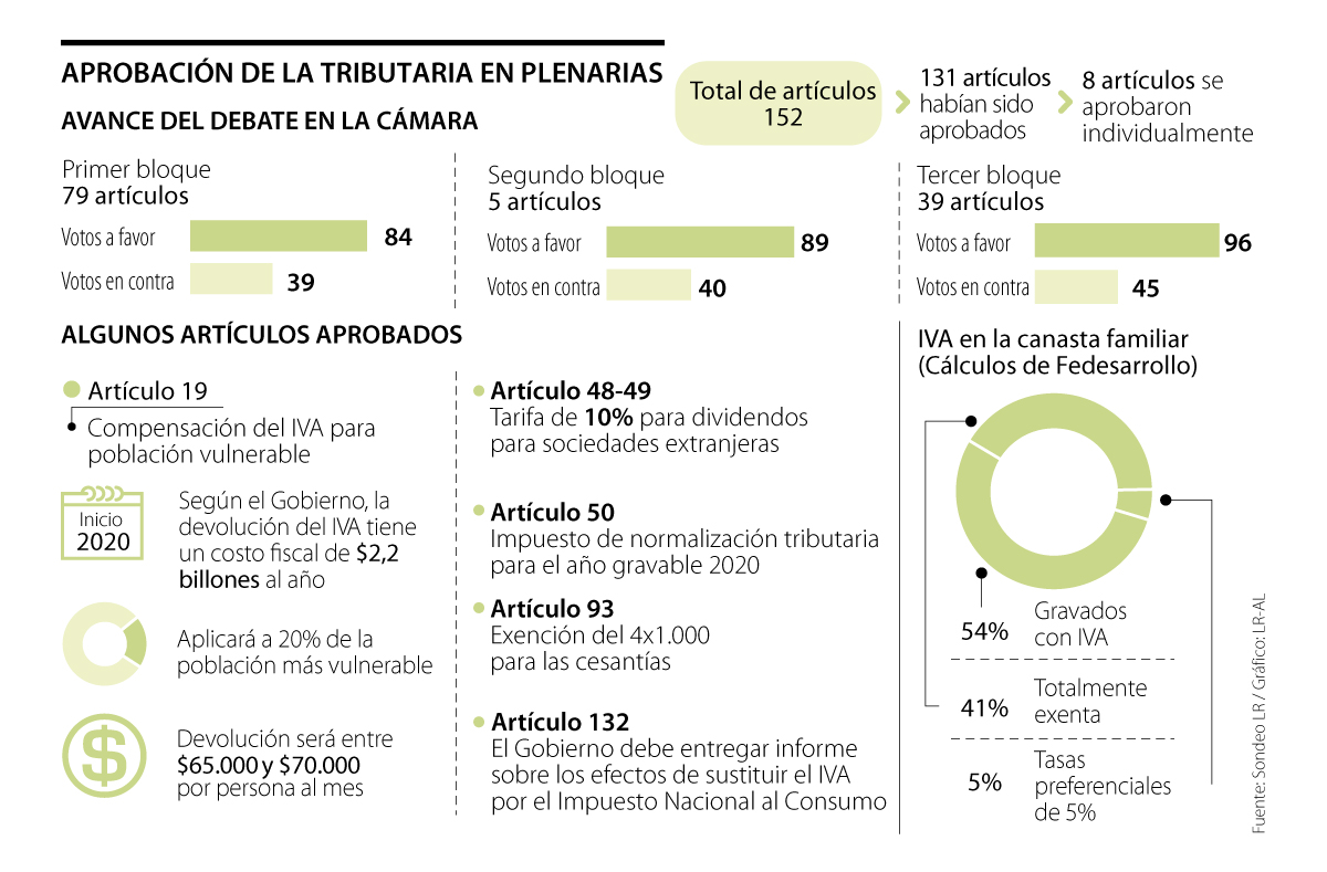 Además, también fueron aprobados en el debate de Cámara los artículos 48 y 49, relacionados con una tarifa de 10% para dividendos para sociedades extranjeras; y el artículo 39, que modificó la tabla de rangos para retención en la fuente de personas naturales, que iniciará en 95 UVT, que equivalen a $3,2 millones.