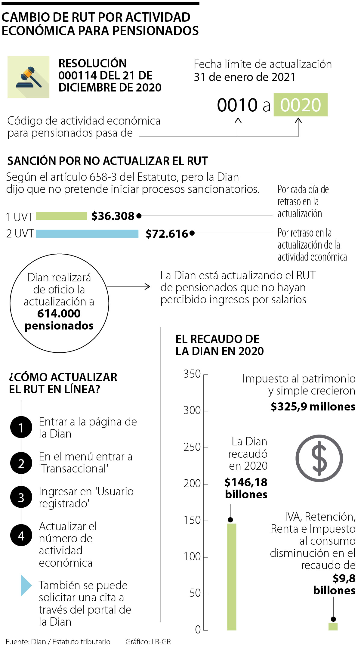 De esta forma, la Dian comunicó que está actualizando automáticamente, de oficio, el RUT de aquellos pensionados que presentaron la declaración de renta durante 2020 informando ingresos por concepto de pensión y que no perciban salarios. En total, en este grupo estarán 614.000 pensionados.