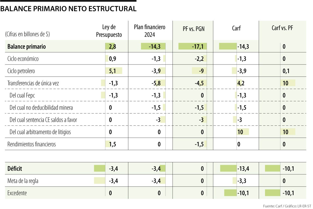A principios de este año, el Carf aseguró que el escenario del Gobierno en el que incluye como ingreso $10 billones por arbitramento de litigios como ingreso en el Plan Financiero para 2024, no sería prudente, ya que el comité considera que estos recursos son ingresos no estructurales, porque resultan de una desacumulación de un activo contingente y que, por tanto, no deberían programarse para financiar gasto estructural.