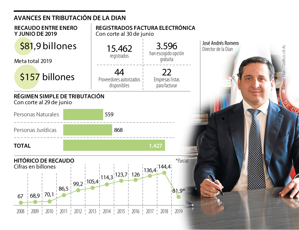 El director de la Dian también anunció que en lo que va del año, la entidad ya ha logrado recaudar $81,9 billones, y que tiene seguridad en que para diciembre se logrará llegar a la meta total que se tiene para 2019 de $157 billones. Romero destacó también que uno de los grandes logros ha sido la implementación del régimen simple, pues con corte al 29 de junio ya se encontraban 1.427 inscritos, de los cuales 559 son personas naturales .