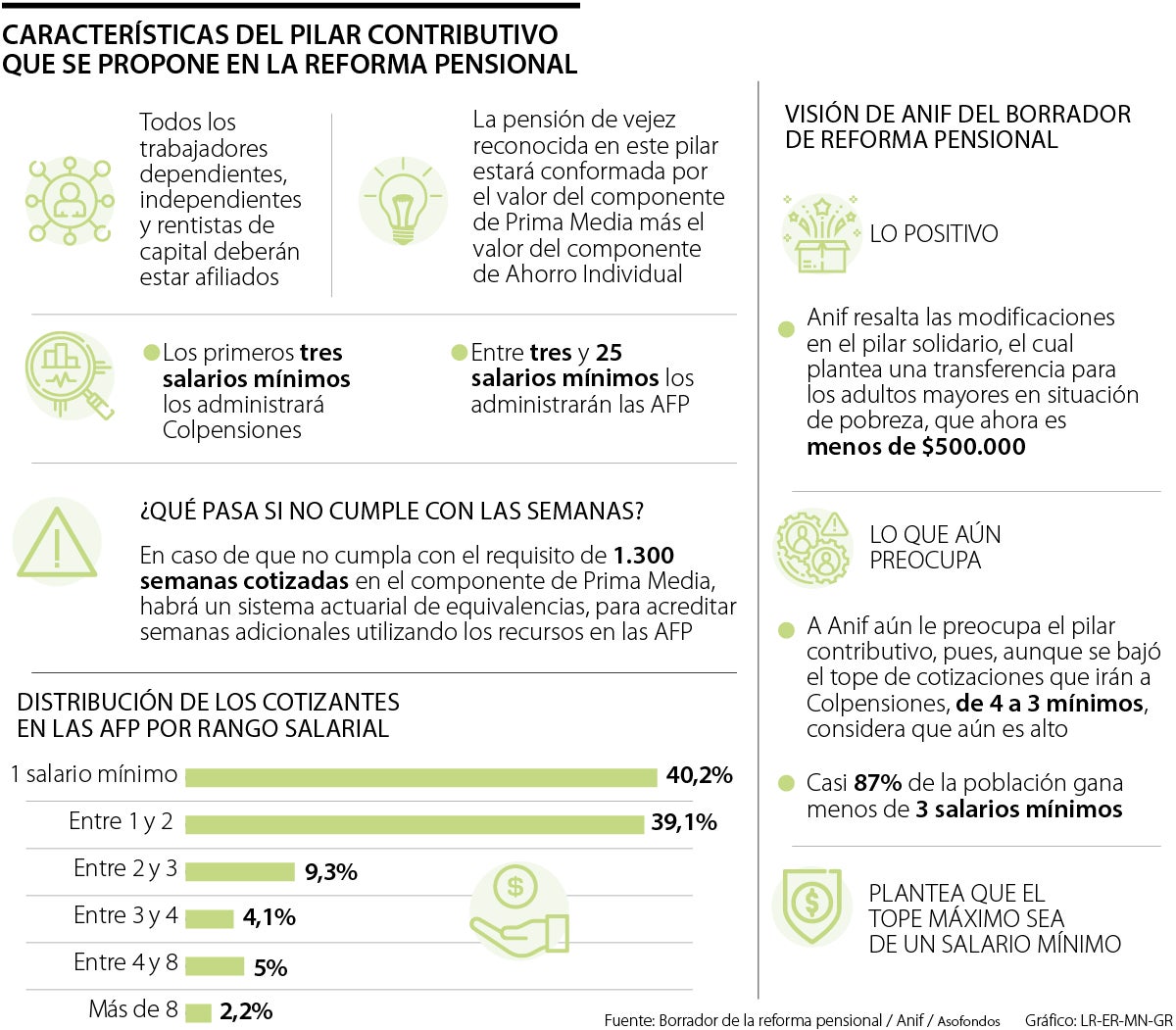 Aunque los expertos rescatan que el tope de cotización en Colpensiones se redujo de los cuatro mínimos que había propuesto el presidente, Gustavo Petro, inicialmente, a tres salarios mínimos, dicen que aún es alto, pues 87% de la población en Colombia gana menos de tres mínimos.