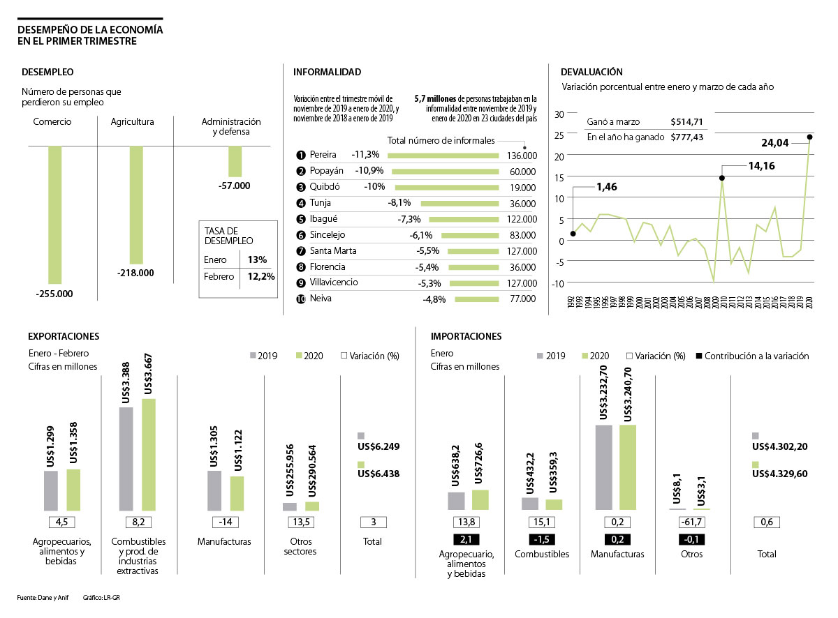 Pero uno de los indicadores que no cedió durante el primer trimestre del año fue el de desempleo, pues en enero pasó de 12,8% de 2019 a 13% en 2020, lo que significó que ese mes 3,2 millones de personas estaban buscando trabajo. En febrero la tasa pasó de 11,8% en 2019 a 12,2% en 2020, periodo en el que 3 millones de personas estuvieron desempleadas.