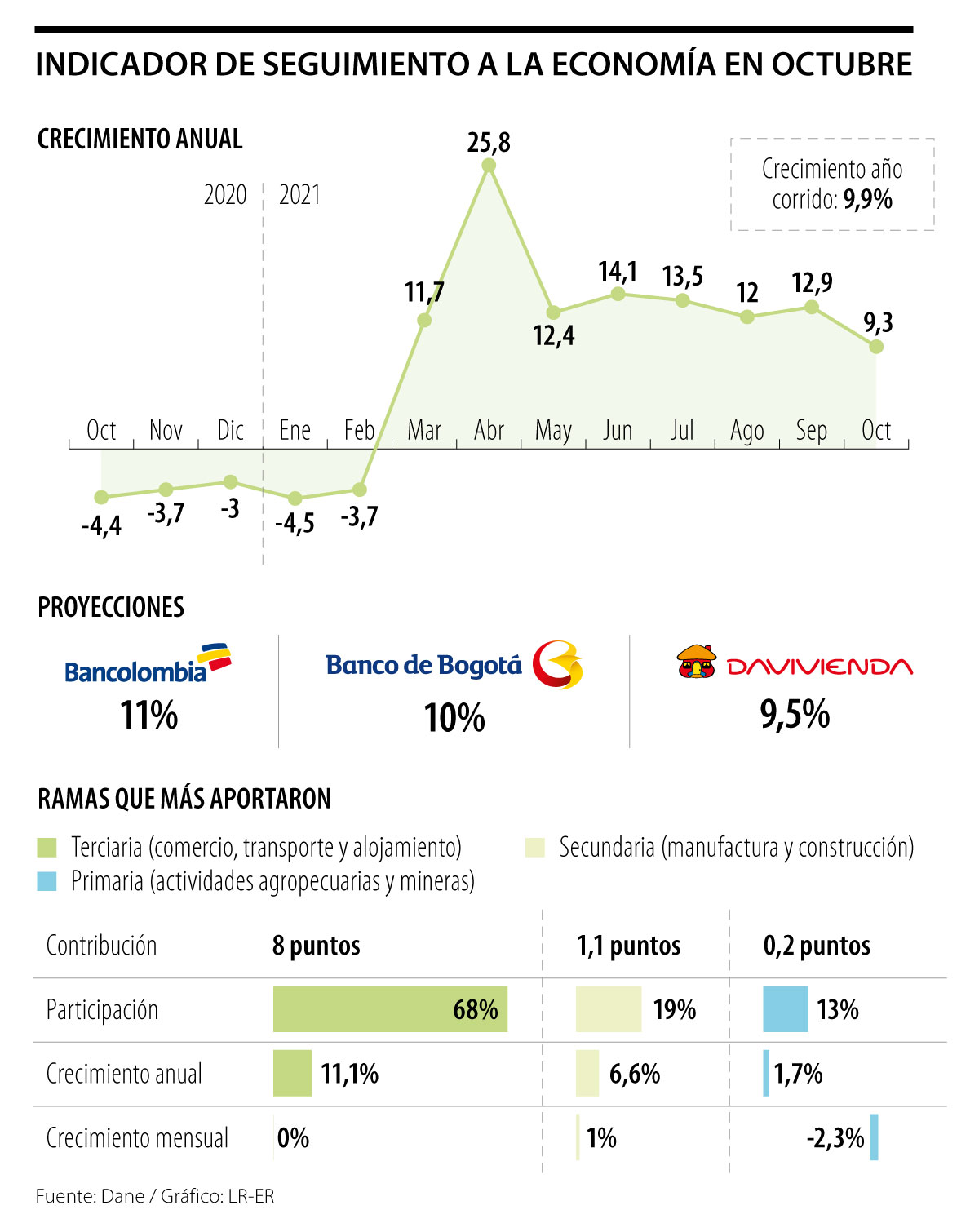 El Indicador de Seguimiento a la Economía (ISE), publicado por el Departamento Nacional de Estadística (Dane), reveló que la economía colombiana, a una tasa anual, creció 9,3% en octubre de 2021. Pese a ser una cifra alta, es la más baja que se registra desde el pasado marzo, mes en el que se evidenció un crecimiento de 11,7%.