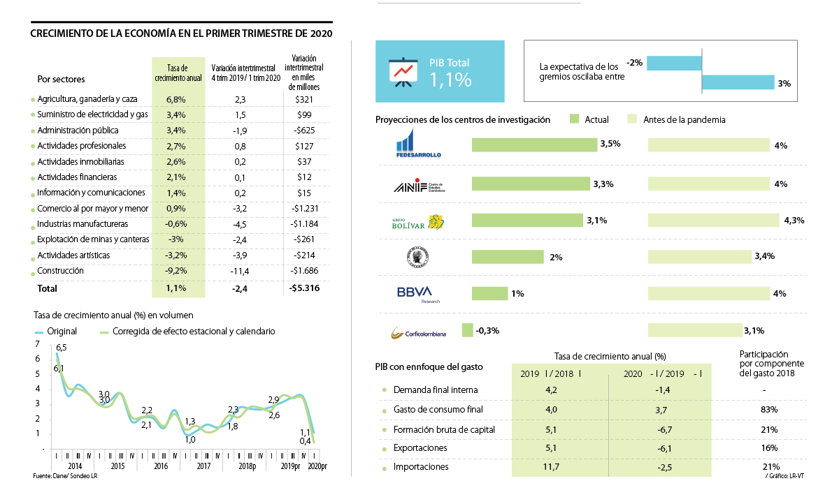 Así lo confirmó el Dane ayer cuando reportó que el PIB anual del periodo enero - marzo de 2020 había crecido 1,1%. Cifra que, pese a ser positiva, se redujo en 180 puntos básicos respecto al mismo lapso de 2019, y estuvo por debajo de los diagnósticos promedio dados por los centros de investigación económica, los gremios e incluso, de la previsión oficial del Banco de la República, puesto que, en general, los cálculos rondaban un alza de 2%.