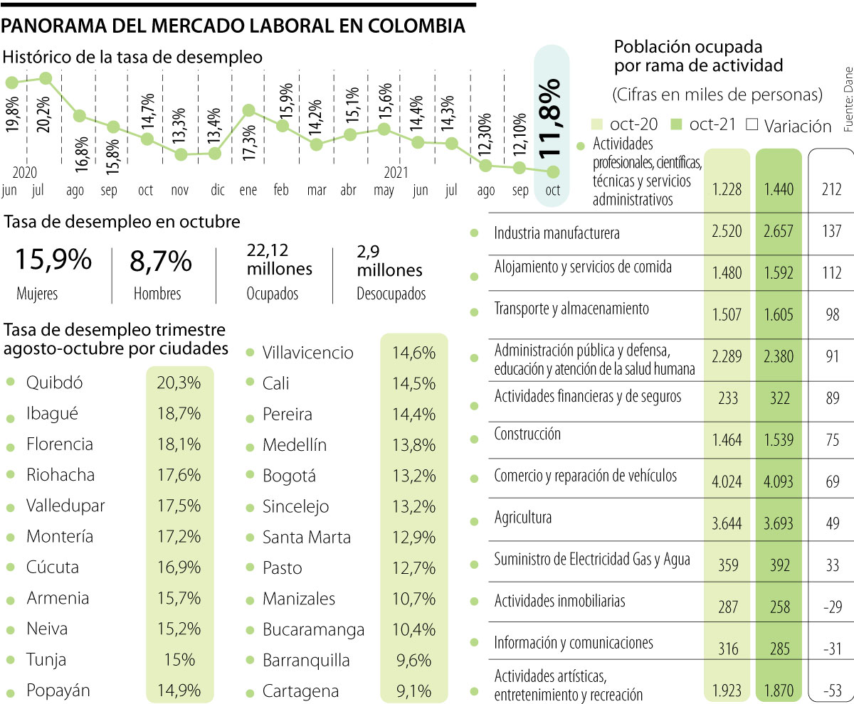 Mientras tanto, en el trimestre móvil de agosto a octubre todas las ciudades registraron una caída en la tasa, siendo Quibdó (20,3%) Ibagué (18,7%)y Florencia (18,1%), las que exhiben los mayores niveles de desocupación.