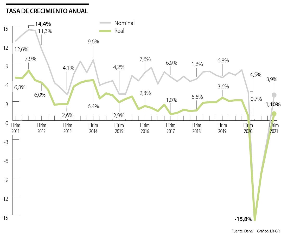 A pesar de que el mercado esperaba que la economía colombiana continuara en números negativos, el Departamento Administrativo Nacional de Estadística (Dane) informó que, en el primer trimestre del año, el Producto Interno Bruto (PIB) tuvo un crecimiento anual de 1,1%, pues alcanzó una suma de $208,7 billones en precios constantes, lo cual es $2,2 billones más de lo que se registró en el mismo periodo del año pasado ($206,4 billones).