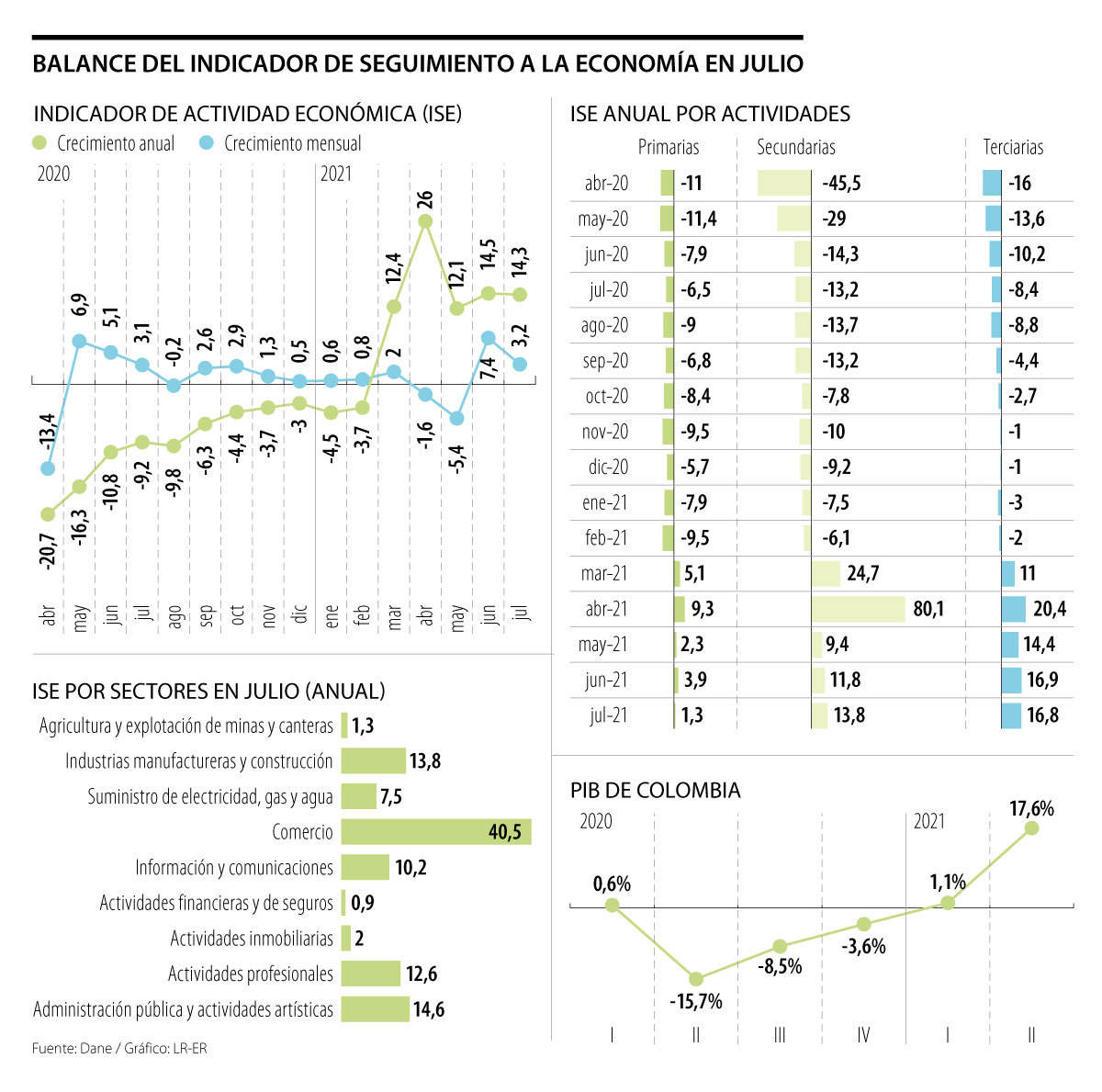Este resultado se reportó para el mes de julio, cuando, según el Indicador de Seguimiento a la Economía (ISE), el crecimiento anual fue de 14,3%. Mientras que, si se comparan los resultados de forma intermensual, la economía registró un alza de 3,2%.