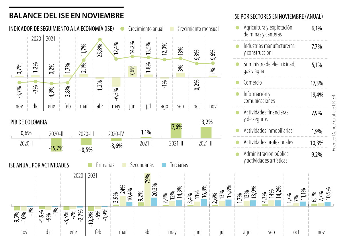 Diferentes proyecciones indican que Colombia sería líder en materia económica en la región; y así lo ha demostrado la actividad productiva del país, que entre enero y noviembre creció a una tasa anual de 9,86%, según el último reporte del Indicador de Seguimiento a la Economía (ISE) del Dane.