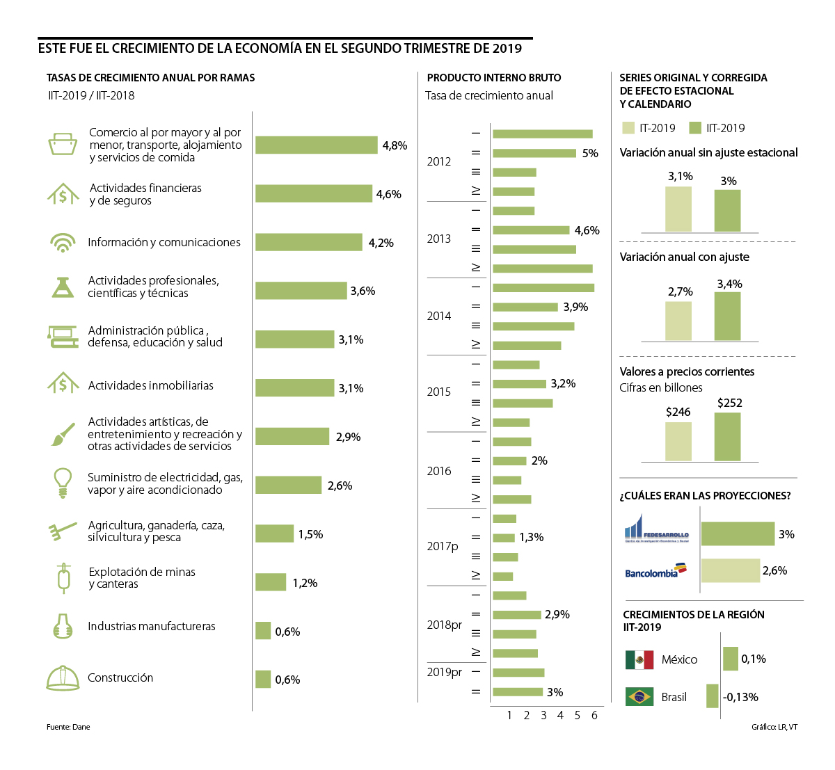 En el segundo trimestre, la economía colombiana confirmó su tendencia de recuperación al crecer a un ritmo de 3% gracias al impulso del comercio (4,8%) y de las actividades financieras (4,6%). Además, se vio un leve crecimiento tanto de la industria (0,6%) como de la construcción (0,6%), aunque aún no crecen a los ritmos que se esperan. Los anuncios del Dane favorecen a las metas del Gobierno, pues la entidad no solo revisó al alza la variación del crecimiento del primer trimestre, desde 2,8% hasta 3,1% anual, sino que reveló que el PIB desestacionalizado del segundo trimestre creció 3,4%.