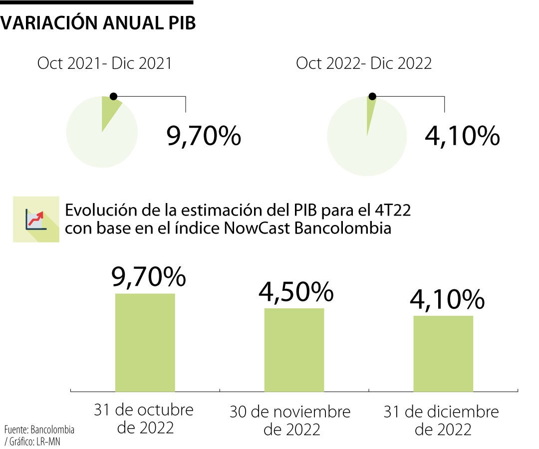 ritmo de 4,1%. Esto significa un retroceso de 20 puntos básicos frente al trimestre móvil terminado en noviembre, cuando se presentó un crecimiento de 4,3%. Según los expertos de la entidad, la actividad económica en todo 2022 creció a un ritmo cercano a 8%.