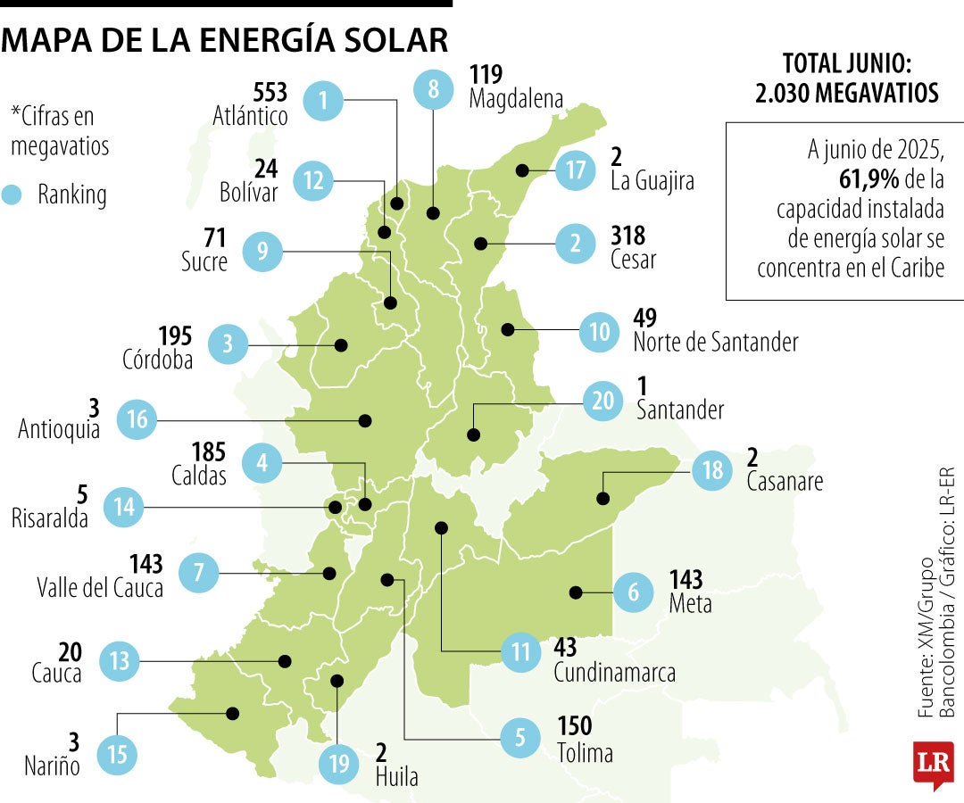 Gran parte de la generación solar se concentra en la región Caribe, debido al alto potencial de irradiación solar. Los departamentos con mayor capacidad instalada son Atlántico, con 553 megavatios, energía suficiente para abastecer entre 2 y 2,21 millones de hogares; seguido por Cesar (318 megavatios), Córdoba (195 megavatios), Caldas (185 megavatios) y Tolima (150 megavatios).