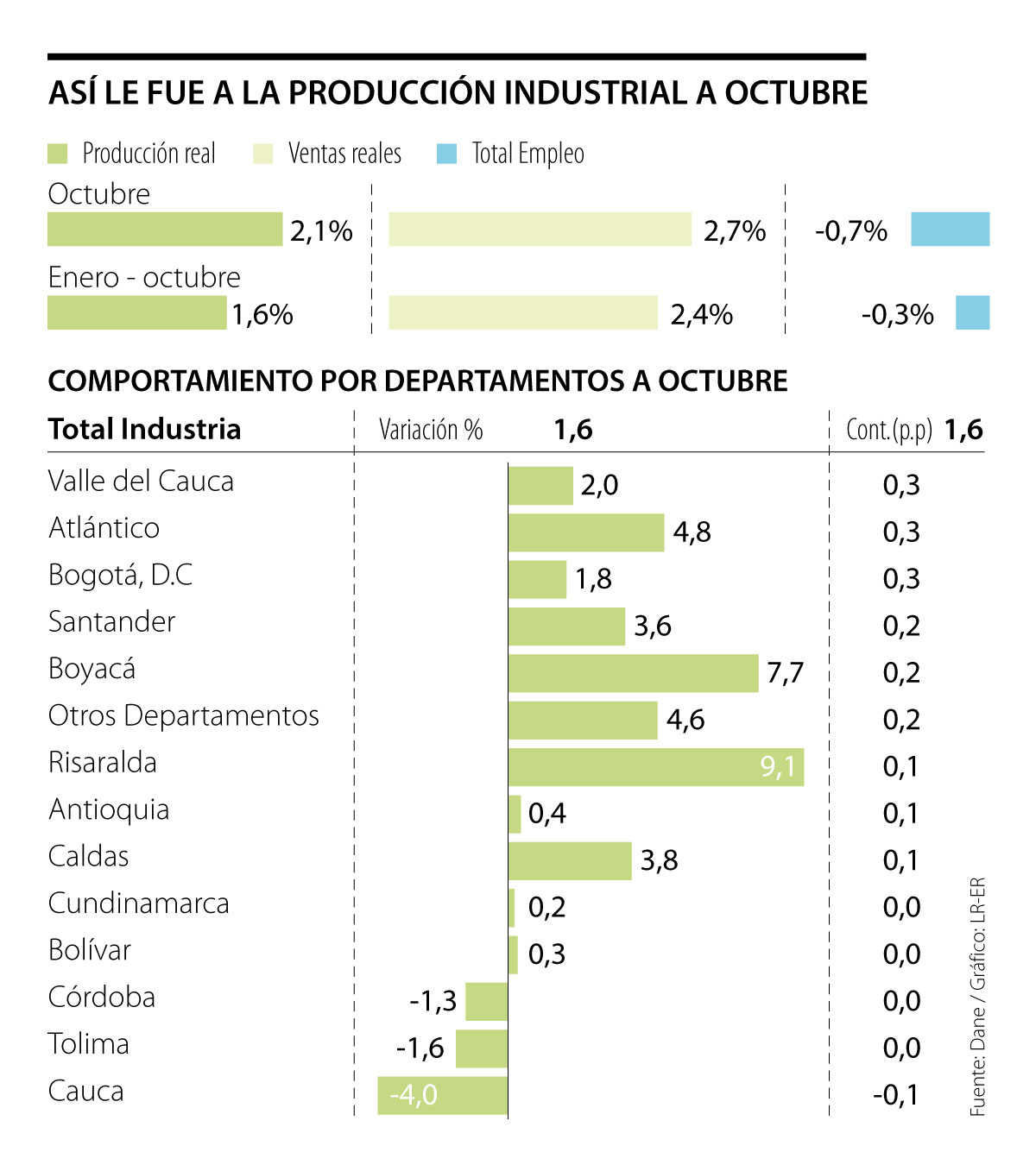 El Departamento Administrativo Nacional de Estadística (Dane) reveló ayer que la producción de la industria manufacturera en los primeros diez meses del año se elevó 1,6%, mientras que las ventas crecieron 2,4% en el mismo periodo. En este consolidado, según explicó la entidad, la fabricación de carrocerías para vehículos y los artículos de viaje y bolsos jalonaron el indicador con variaciones de 58,4% y 22,6%, respectivamente.