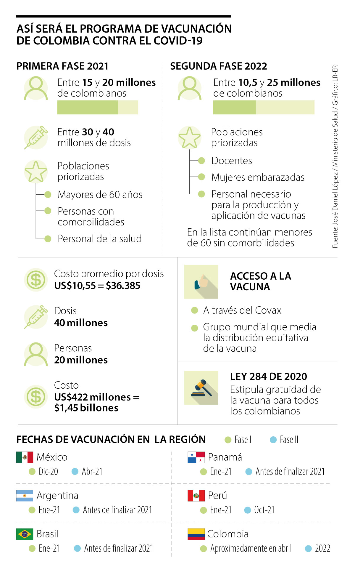 “Entre más tiempo haya durante 2021 para realizar la vacunación, más personas podrán vacunarse. En el momento se espera poder vacunar entre 15 y 20 millones de colombianos en 2021, lo que equivale aplicar de 30 a 40 millones de dosis”, explicó en el documento.