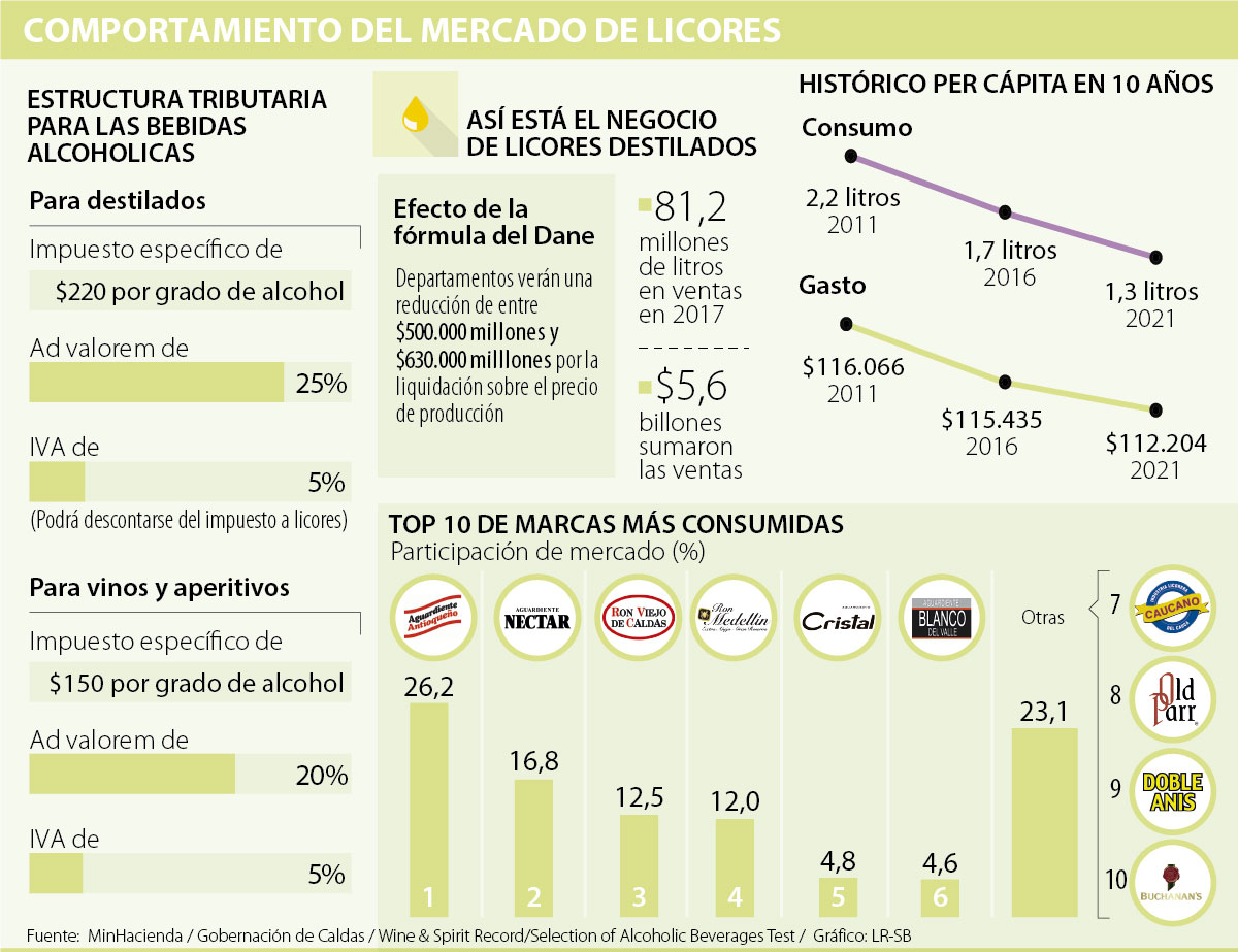 Esta pérdida obedece a una contracción en la tarifa del impuesto ad valorem, introducido en la Ley de Licores, que fue requisito para que el país pudiera acceder a la Organización para la Cooperación y el Desarrollo Económico (Ocde). Dicho impuesto se fijó en 20% para vinos y aperitivos y 25% para los destilados, sin contar el impuesto específico de $150 y $220, respectivamente, por cada grado de alcohol.