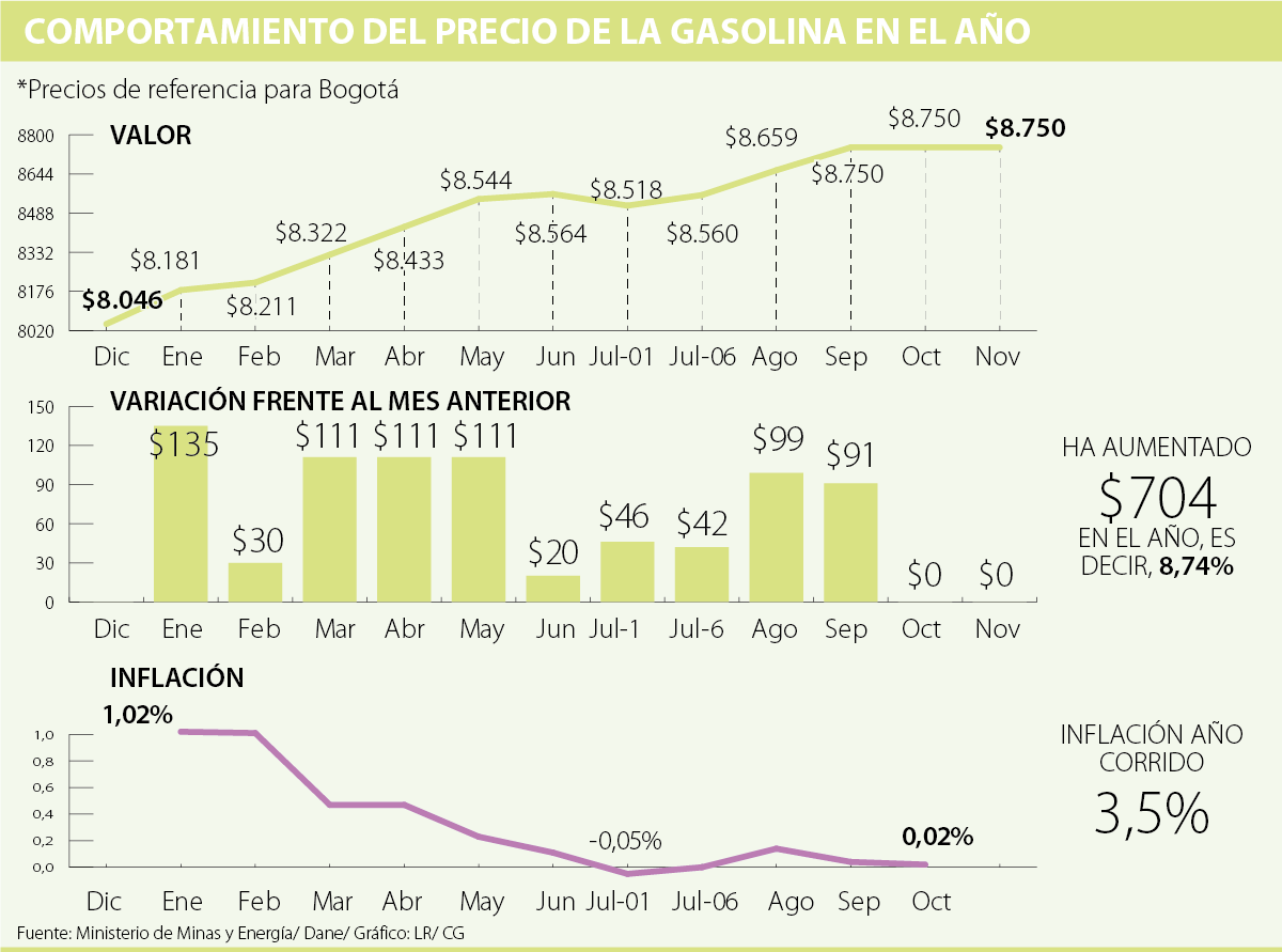 En los últimos tres meses, el precio de referencia de la gasolina (para el caso de Bogotá) se ha mantenido en $8.750 según el Ministerio de Minas y Energía.