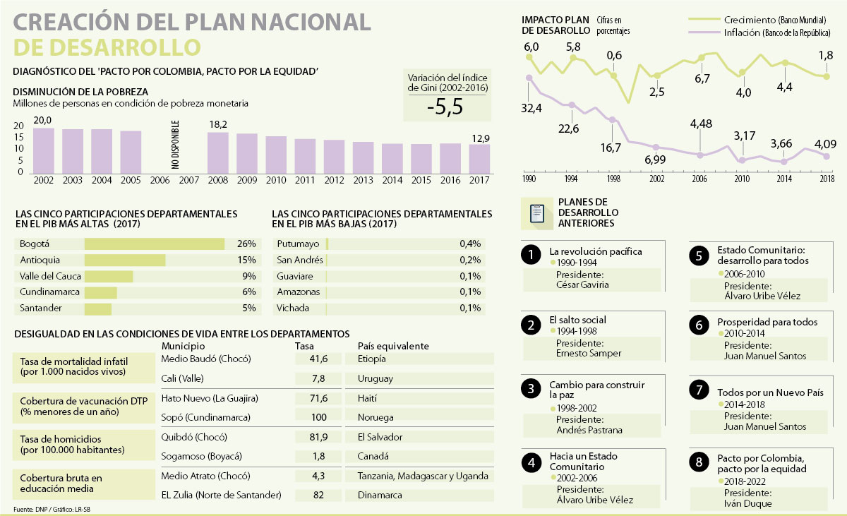 El plan de Iván Duque se llama ‘Pacto por Colombia, pacto por la equidad’ y se basa en lograr la equidad por medio de la legalidad y el emprendimiento. Sus bases se están construyendo desde las propuestas de los departamentos y talleres regionales. Hasta el momento, los ejes de los que ha hablado el Presidente son el crecimiento verde; ciencia, tecnología e innovación; descentralización, y transformación digital. Además, se tendrán en la cuenta los objetivos de desarrollo sostenible. En el diagnóstico, el Gobierno parte de que el país ha avanzado: se redujeron la pobreza, la desigualdad y el desempleo informal, pero estos siguen siendo altos, y los retos económicos no son menores. Por eso, Duque ha usado constantemente la palabra resiliencia y hace un llamado a trabajar con unidad.
