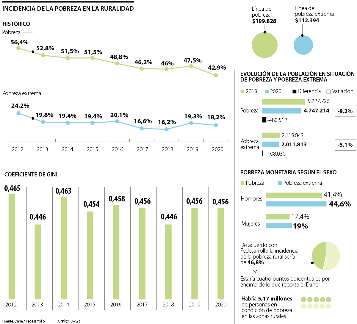 Según las cifras del Dane, en 2020 la línea de pobreza monetaria en las zonas rurales fue de $199.828, mientras que en 2019 esta fue de $210.969, lo que significó una reducción de 5,3% en pleno año de la pandemia. De acuerdo con el director de Fedesarrollo, esta reducción no tendría una explicación económica convincente, pues el año pasado la inflación en los hogares pobres llegó a 2,3%.