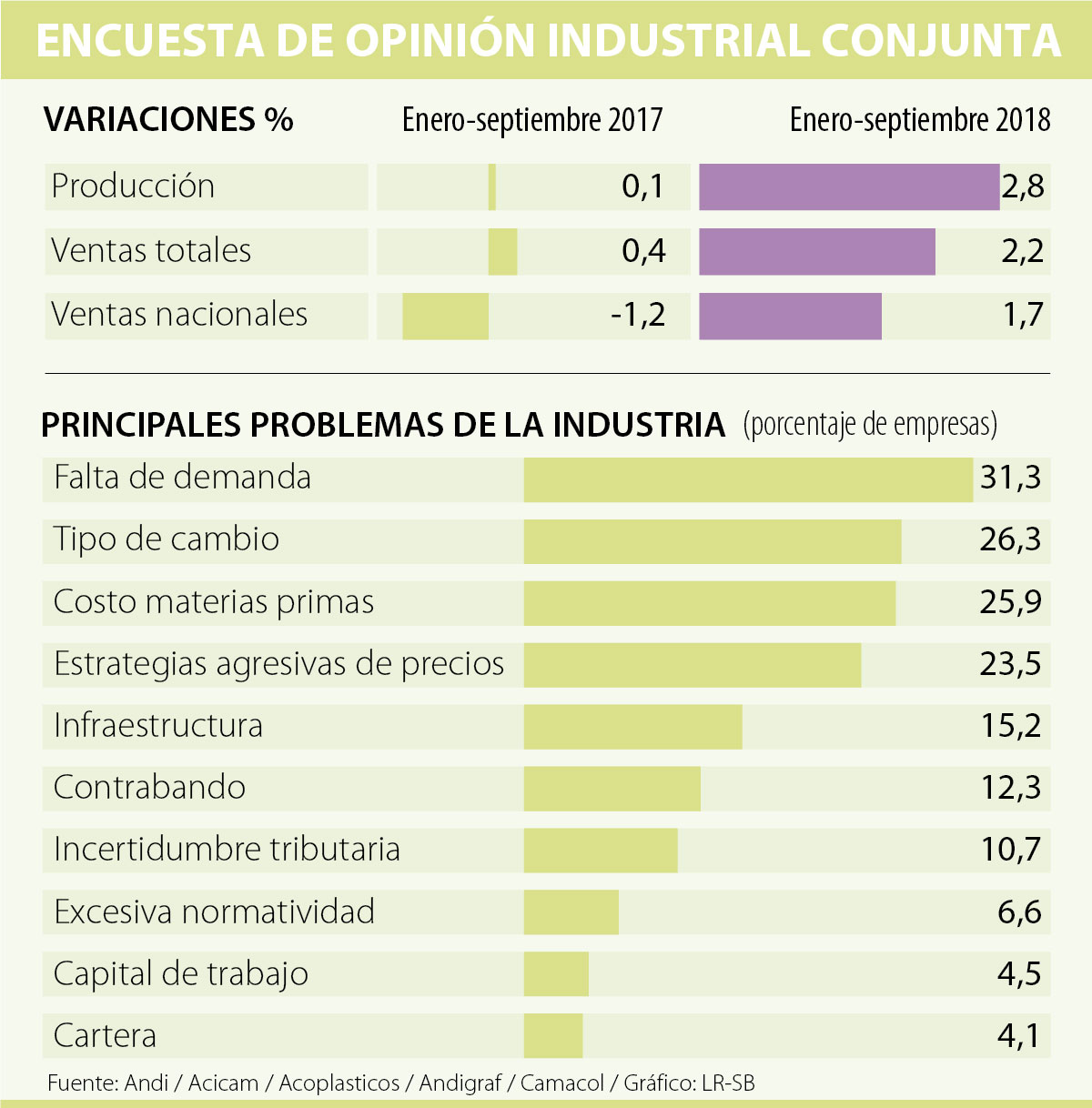 Además, las ventas totales aumentaron 2,2% y las ventas en el mercado nacional crecieron 1,7% frente al mismo periodo de 2017. “Los indicadores del sector industrial están por encima de los promedios históricos. Es así como el volumen de pedidos se ha estabilizado en niveles altos; la situación favorable de la industria y las mejores expectativas muestra mejoría con respecto al tercer trimestre del año pasado”, indicaron los gremios en un comunicado.