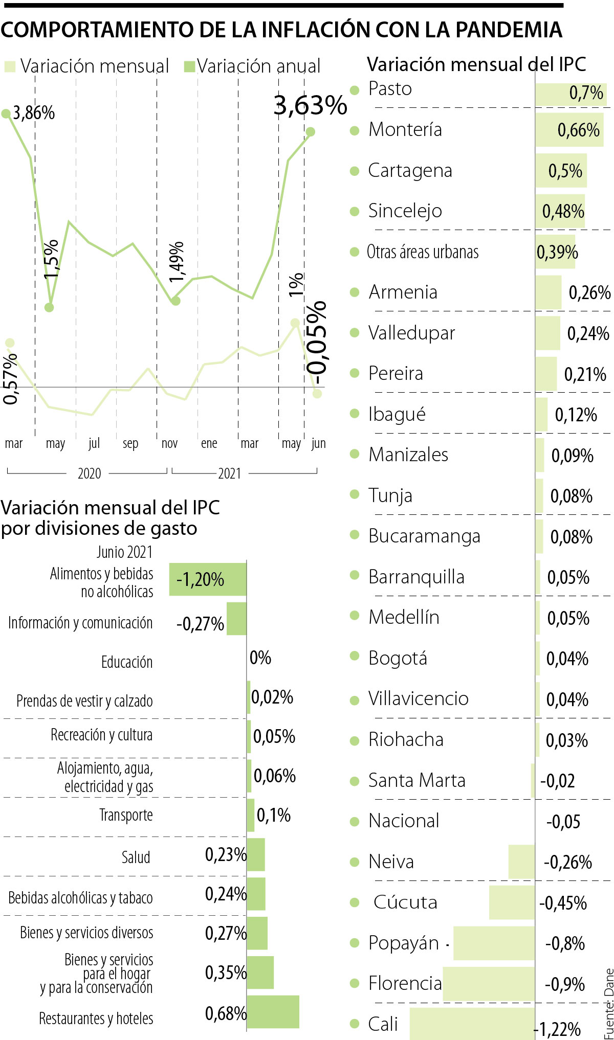 El Dane actualizó la variación del Índice de Precios al Consumidor (IPC), que para junio fue de -0,05%; en el año corrido, de 3,13% y anualizada escaló a 3,63%. El dato de los últimos 12 meses sorprendió al mercado porque es el nivel más alto desde el inicio de la pandemia, pues en marzo de 2020 la cifra llegó a 3,86% y empezó a descender.