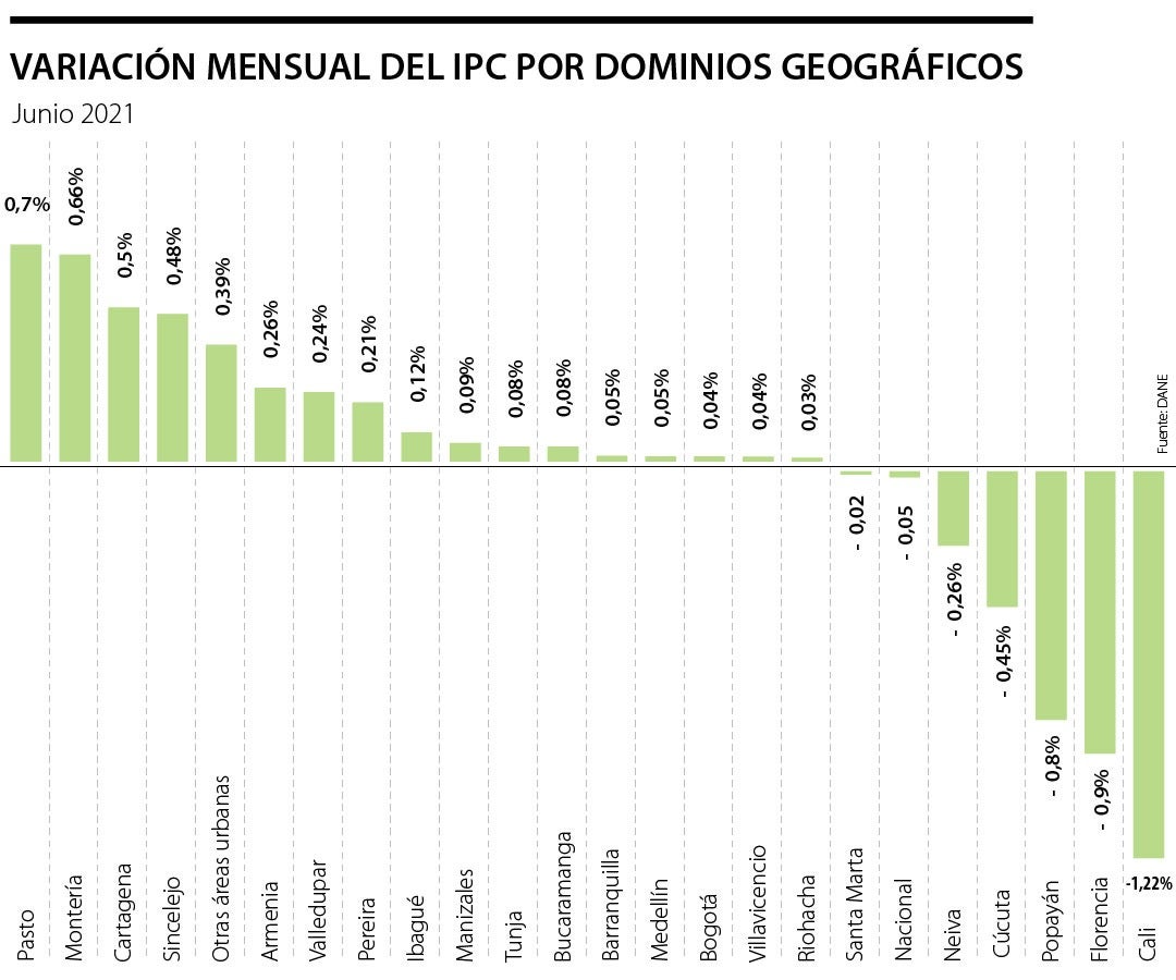 Por otro lado, Cali, que había liderado la inflación de mayo al ser el epicentro del paro, presentó un ajuste de -1,22%, el mismo efecto se presentó en Florencia, -0,9%; Cúcuta, -0,8% y Neiva, -0,45%. Estas ciudades se ubicaron por debajo del promedio nacional, que volvió a ser negativo en junio.