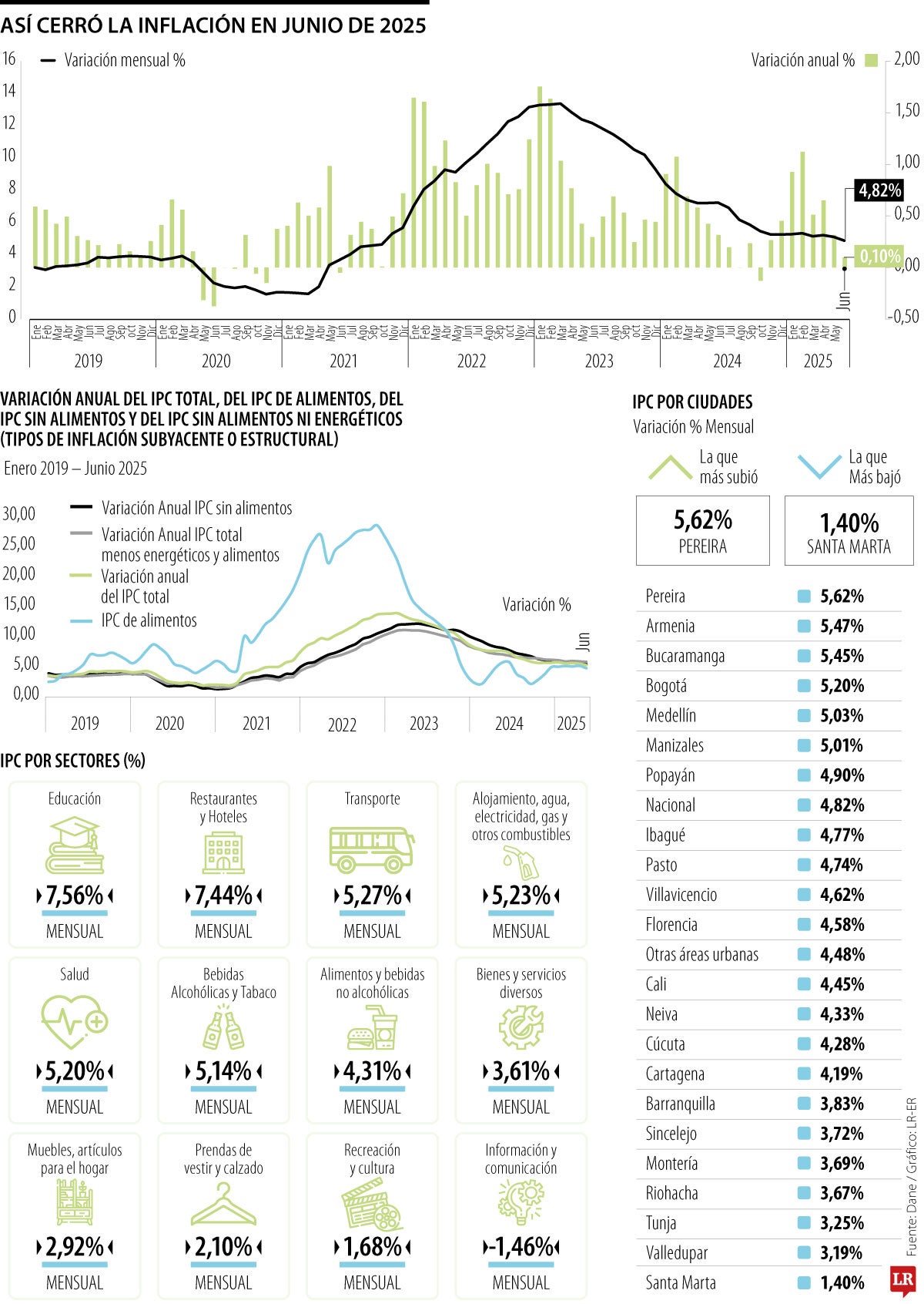 El Departamento Administrativo Nacional de Estadística, Dane, reveló que la inflación cerró en 4,82% en junio de 2025, con lo cual se ubicó dentro de las proyecciones del mercado, en las que se estimaba que la variación estaría entre 4,77% y 5,03%. Estas cifras no se veían desde octubre de 2021.