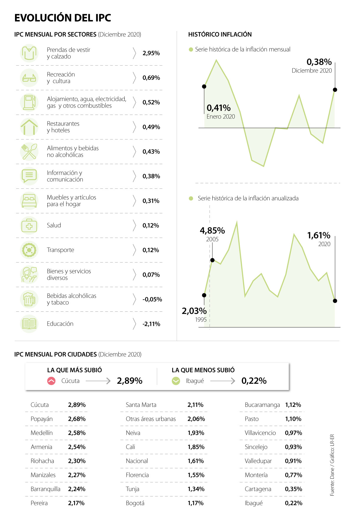 "Este 1,61% de inflación anual ubica al IPC de 2020 como el más bajo de la historia estadística del Dane puesto que cuando se inició la medición del Índice de Precios al Consumidor en 1954 se registró para 1955 una inflación cercana a 2,03%", aseguró Oviedo.