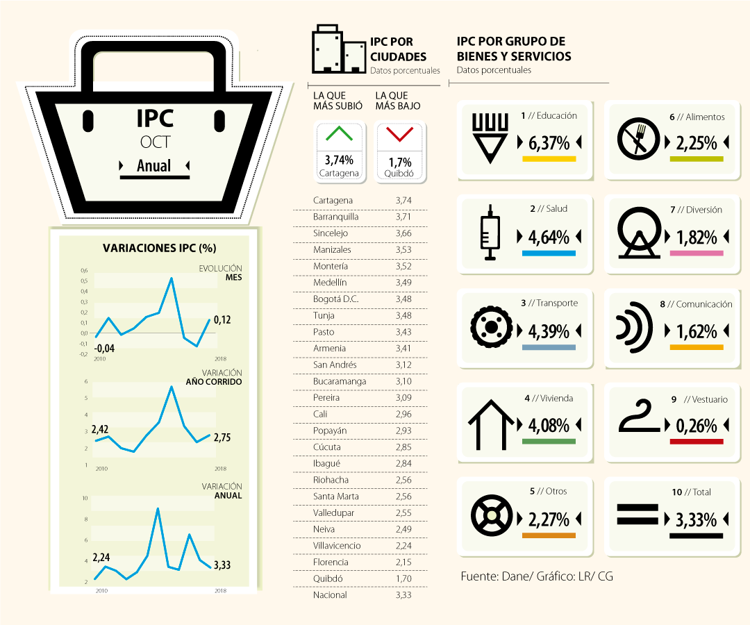 Según el boletín del Dane, en octubre de 2018 en comparación con octubre de 2017, la variación de los gastos básicos que más aportaron fueron: arrendamiento imputado (3,55%), arrendamiento efectivo (3,46%), almuerzo (3,43%), energía eléctrica (7,31%), pensiones (8,46%), combustible para vehículos (7,79%), acueducto, alcantarillado y aseo (6,85%), bus (5,51%), matrículas de educación superior y no formal (5,60%) y otras frutas frescas (11,06%). Las mayores contribuciones negativas se presentan en: otras hortalizas y legumbres secas (-22,53%), panela (-19,30%), azúcar (-9,27%), arroz (-2,47%) y salsas y aderezos (-6,80%).