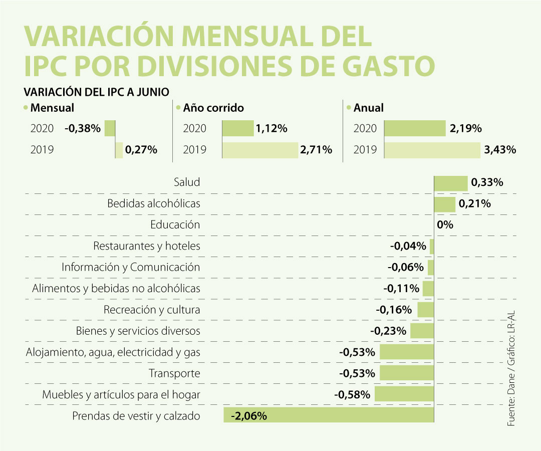 El Departamento Administrativo Nacional de Estadística (Dane) informó que en junio, último mes del primer semestre, la variación del IPC mensual fue de -0,38, la variación año corrido que iba en 1,5% en mayo ahora en junio quedo en 1,12%, por lo que la variación anual quedo en 2,19%, cifra muy distante al 3,43% que se presentó en el mismo periodo del año anterior.