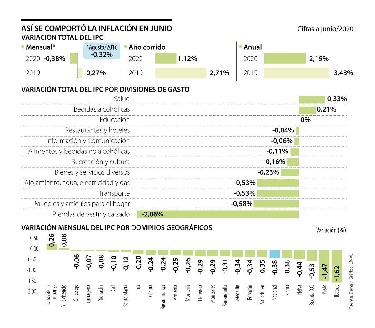 La disminución generalizada en los precios que se viene presentando desde marzo está explicada en la influencia que ha tenido la pandemia sobre la economía y las perspectivas futuras. Bajo este panorama, el Gobierno ha tenido que tomar medidas para mitigar los daños que deja la pérdida de ingresos de los colombianos. Una de esas estrategias y que jalonó la inflación a cifras negativas fue la de reducción de tarifas en los servicios públicos y el arrendamiento, rubros que ocupan gran porcentaje de los ingresos de los ciudadanos. En junio, la variación mensual del IPC de estos fue de -0,53%.