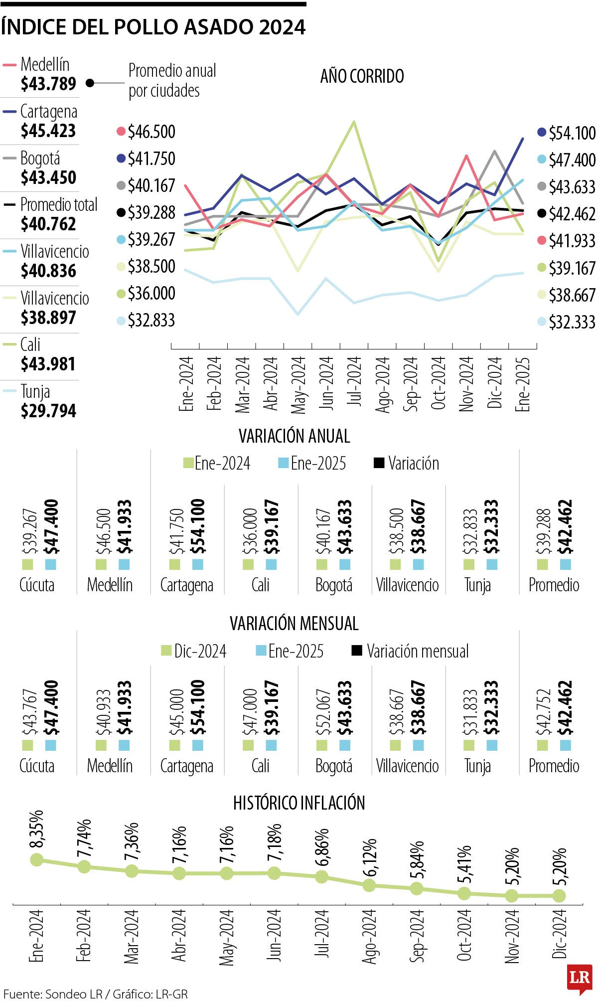 Por ciudades, Cartagena se ubicó como la ciudad con el precio promedio más elevado con $54.100, mientras que Tunja tuvo el valor más bajo, con una media de $32.333. En un año, el precio del pollo asado fue más bajo en Medellín y Tunja (-9,82% y -1,52%) mientras que en Cúcuta, Cartagena, Bogotá, Cali, Villavicencio y Cúcuta fue 13,63% más caro en promedio.