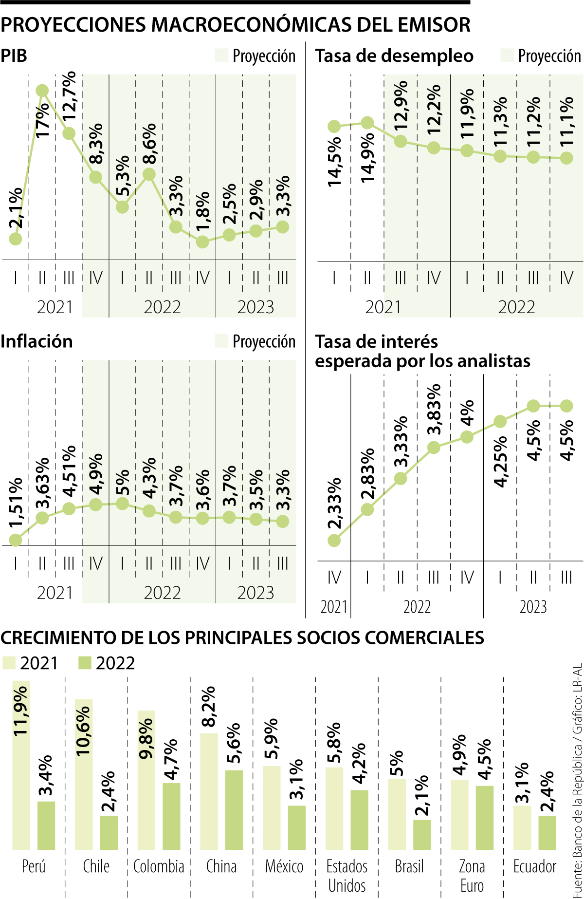 Por el lado del mercado laboral, se prevé que la tasa de desempleo continúe disminuyendo gradualmente, para cerrar 2021 en 12,2% y en 11,1% en 2022.