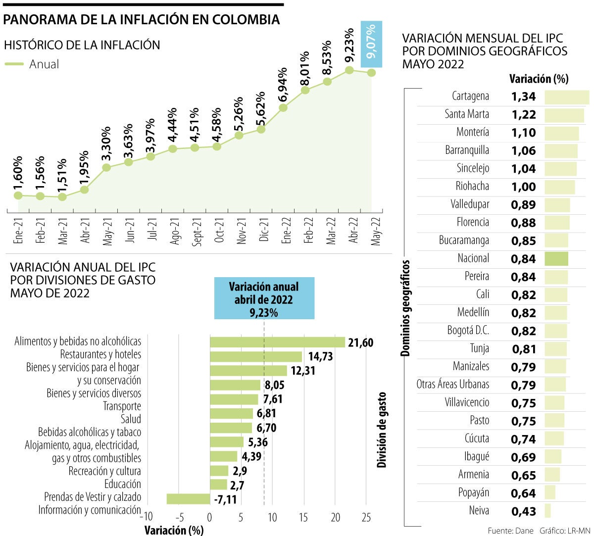 El Departamento Administrativo Nacional de Estadística (Dane) presentó los resultados de la inflación para mayo de 2022, según destacó su director, Juan Daniel Oviedo, la cifra llegó a 9,07%, la variación mensual fue de 0,84% y la de año corrido de 6,55%.