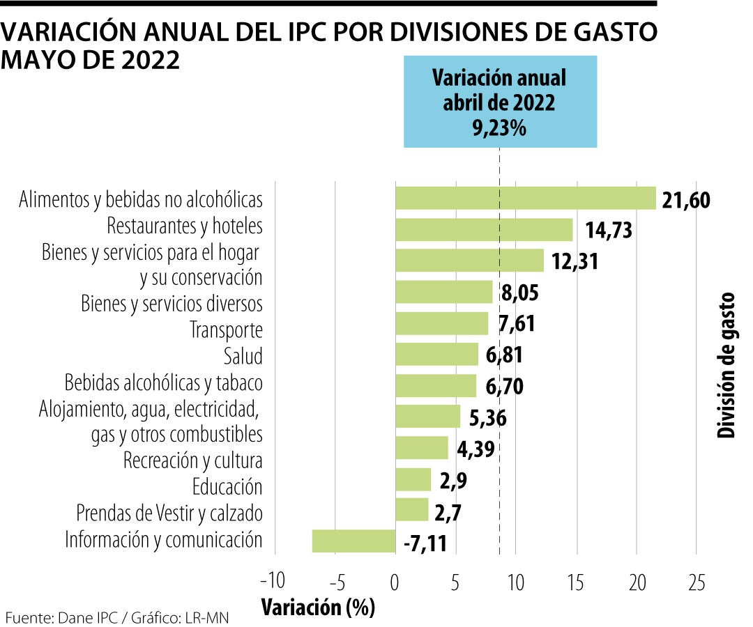 "La inflación de mayo 2022 se vio en línea por lo esperado por el mercado, los analistas y la gente en general, mostrando una desaceleración anual por tema de base estadística, especialmente en los alimentos, este año es menor y está mostrando que la mejora de algunos cultivos están mostrando un techo para la inflación de esta división que sigue alta pero ha disminuido", añadió el economista de Scottia Bank Colpatria, Sergio Olarte.