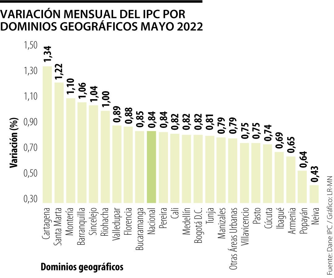 El reporte del Dane muestra también que Cartagena fue el dominio geográfico que presentó la mayor variación mensual (1,34%); seguida por Santa Marta con 1,22% y Montería, 1,10%, que además, se ubicaron por encima del promedio nacional de 0,84%. Mientras que Neiva fue la de la cifra más baja con 0,43%.