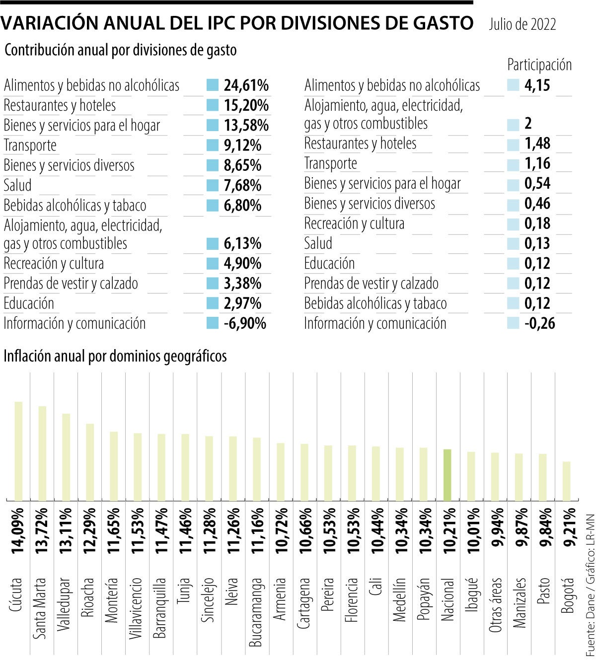 Mirando las cifras más detalladas, Oviedo explicó que el corrientazo y los productos de aseo para el hogar presentaron incrementos anuales de 15,20% y 13,58% en julio de 2022. "La inflación anual, principalmente, se debe a una sobreinflación de alimentos y a un impacto muy importante en la división de electricidad (que aportó 10 puntos porcentuales)", dijo Oviedo.