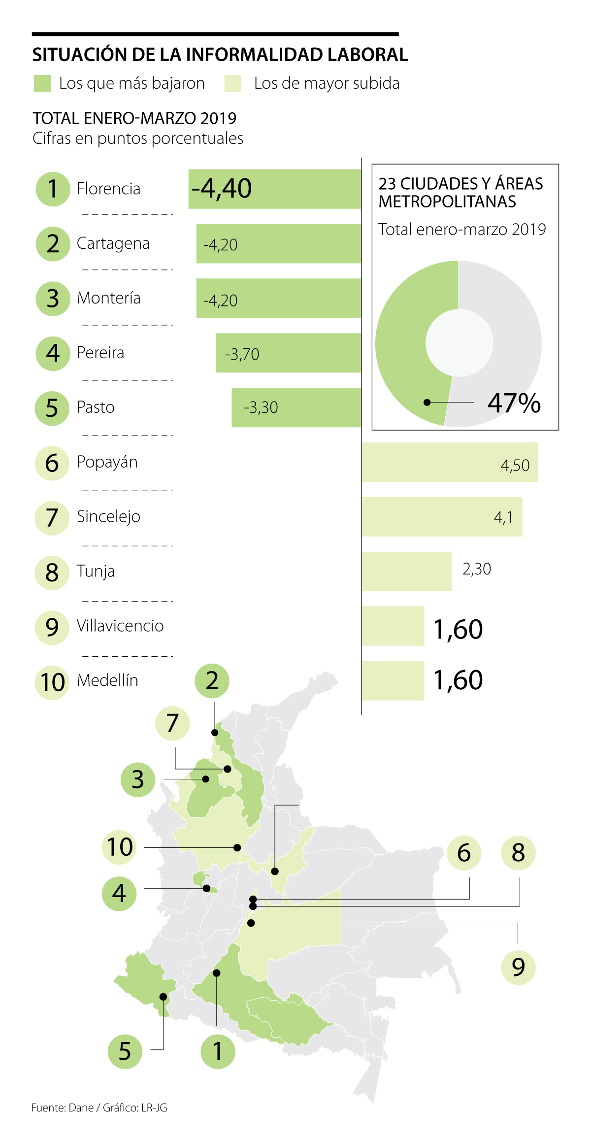 En Colombia, según las cuentas del Dane, al cierre del primer trimestre de este año, el índice de trabajadores que están bajo la informalidad es de 47%, es decir, que esta cifra tuvo una reducción de 1,5 puntos porcentuales si se compara con el mismo periodo de 2018.