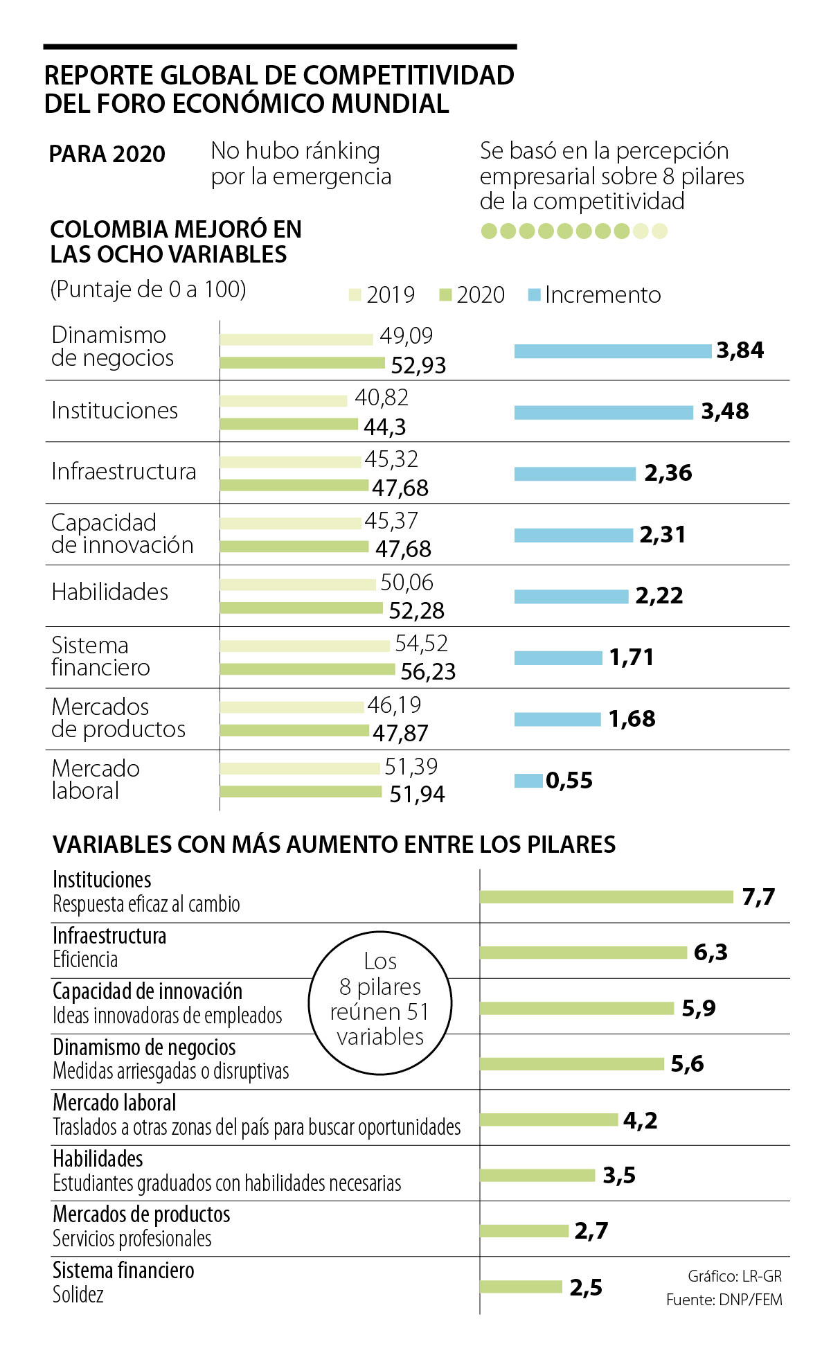 Para este año, el reporte se basó en una encuesta general sobre ocho de los principales pilares que generan competitividad, pero no realizó el tradicional ranking de países debido a la emergencia. Lo más importante que evidenció la medición es que Colombia mejoró en las ocho características que componen este indicador para el sector privado y público.