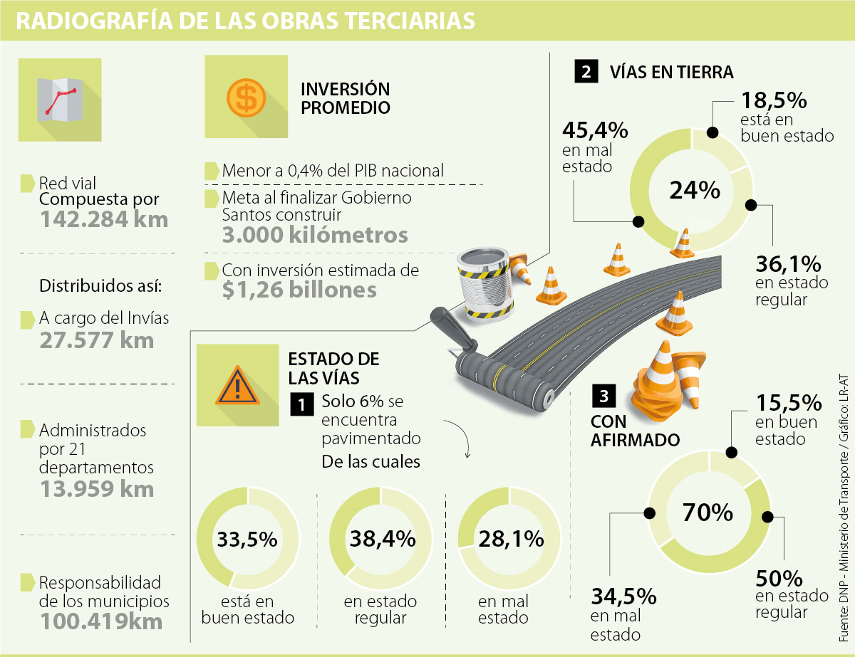 Así mismo, sus condiciones no son óptimas. Según el Departamento Nacional de Planeación (DNP), 70% de toda la red tiene algún tipo de afirmado asfáltico (aunque la mitad en estado regular), mientras que la cuarta parte de todas las terciarias están en tierra, sin intervención y sin condiciones aptas. Además, solo 6% de la red está pavimentada, es decir, cerca de 8.000 kilómetros, de los cuales ni siquiera la tercera parte está en buen estado.