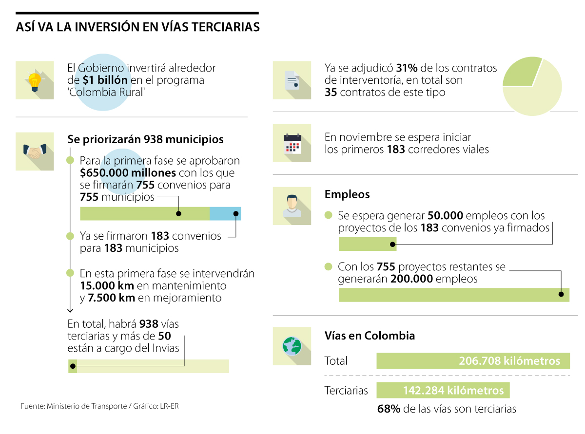 En total, el Gobierno intervendrá en 938 municipios un número igual de proyectos de vías terciarias e invertirá alrededor de $1 billón, los cuales, según la viceministra de Infraestructura, Olga Lucía Ramírez, generarán legalidad y mejorarán las economías locales, que por años han sido olvidadas.
