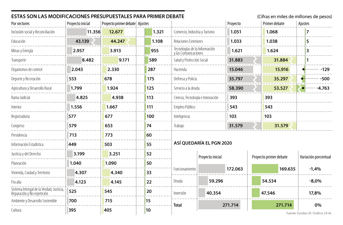Con la radicación ayer de la primera ponencia para debate en las comisiones económicas conjuntas, se volvieron a redistribuir los recursos del Presupuesto General de la Nación para 2020 siendo los ganadores de esta nueva torta algunos rubros como el de la Inclusión social, Educación, y Minas y Energía frente al de Defensa y Hacienda, que son los únicos que verían reducir sus asignaciones.