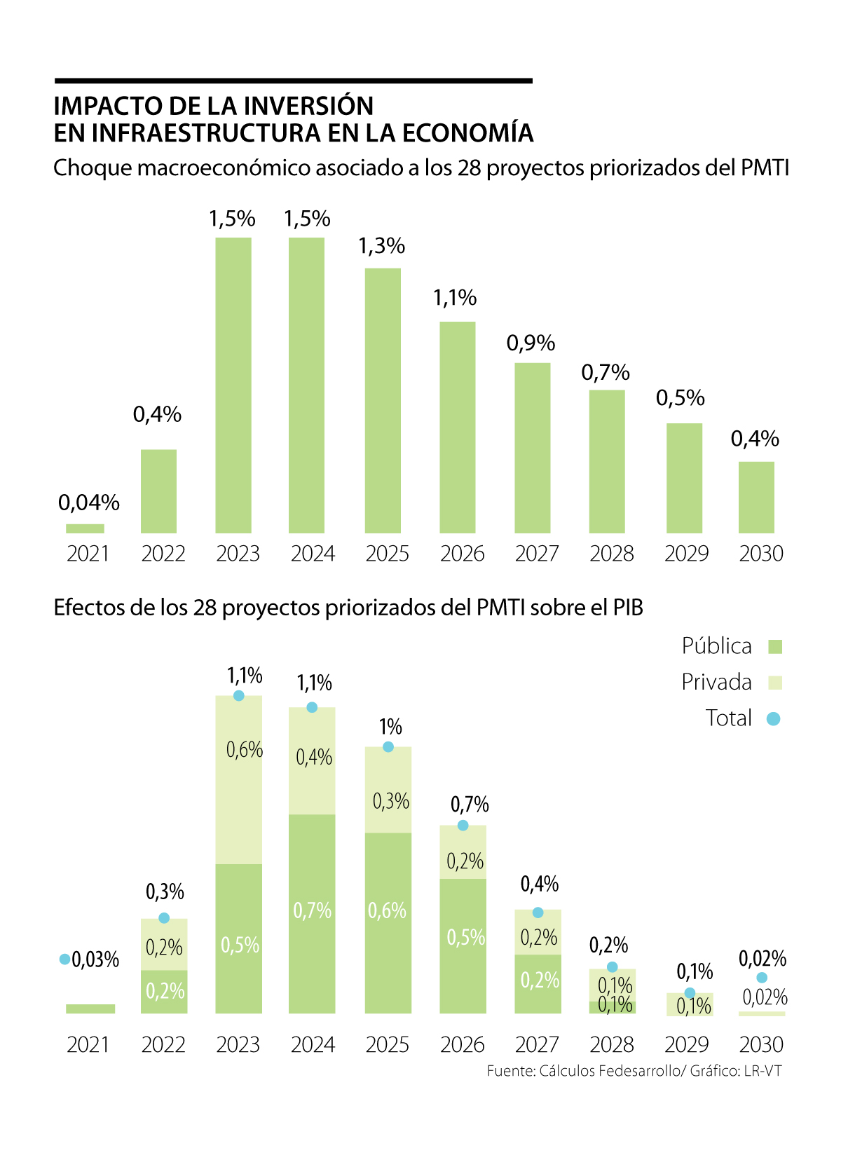 Según el estudio ‘Impacto Macroeconómico y Social de la Inversión en Infraestructura en Colombia 2021-2030’ presentado por Fedesarrollo, este choque llevará a que la economía local crezca a tasas negativas y haya un deterioro importante en sus cifras de empleo y calidad de vida. Por lo que, el mismo informe, resalta que una mayor inversión en obras públicas y privadas (0,5% del PIB) hará que la economía crezca 0,8 puntos adicionales cada año durante una década.